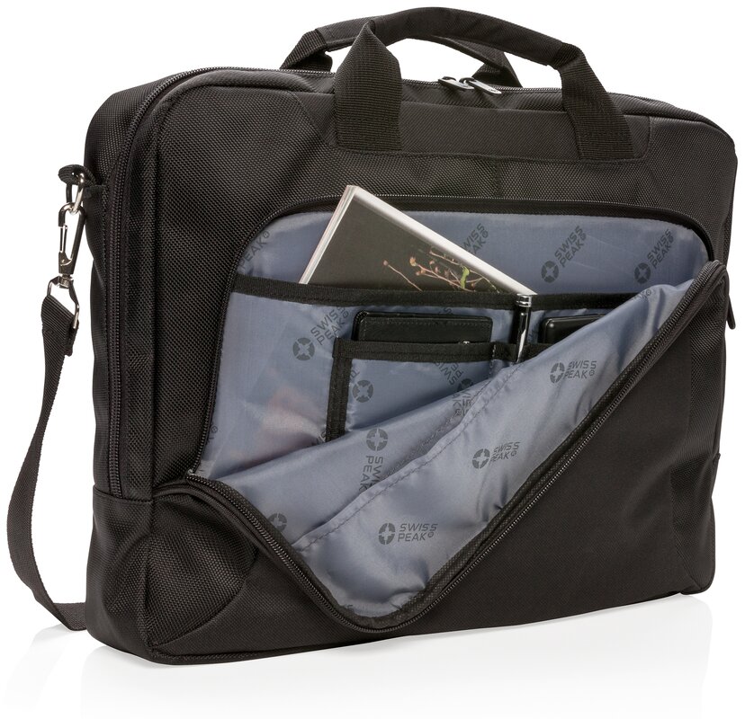 Luxusní brašna na 15,6” notebook, která obsahuje provedení s několika kapsami a polstrovanou kapsou na notebook, hlavním oddílem s velkým prostorem a přední kapsou na zip pro další cennosti, například mobilní telefon a záložní zdroj. Produkt je vyroben z polyesteru 1680D a je bez PVC.
