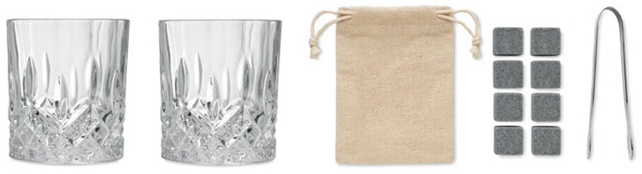 Luxusní whisky skleničky v bambusové dárkové krabici. Obsahuje 2 skleničky (300 ml), 8 opakovaně použitelných kamenných kostek, bavlněný sáček a kleště. Bambus je přírodní materiál, obaly se odstínem mohou trochu lišit.