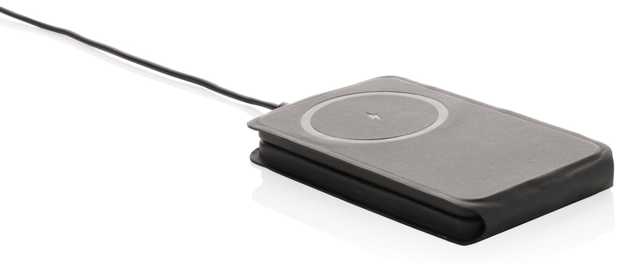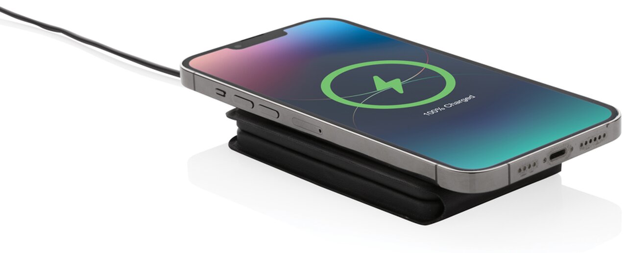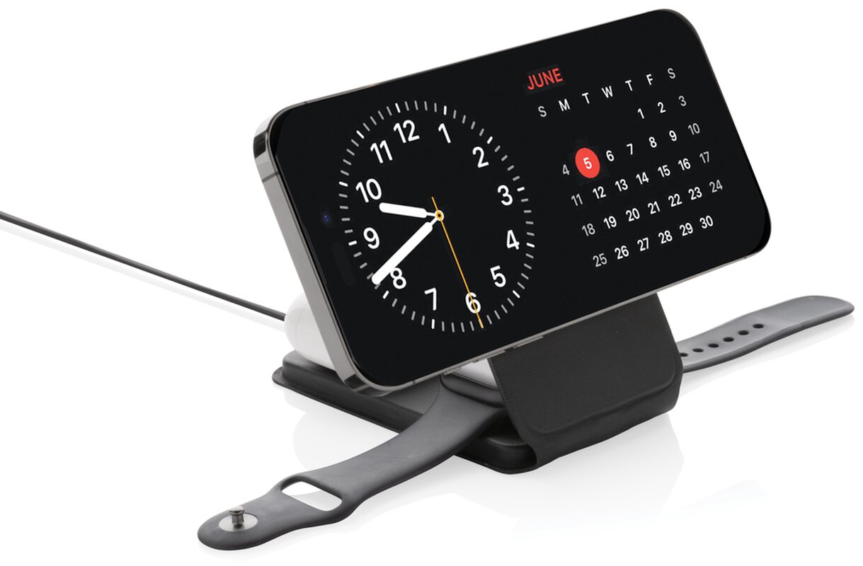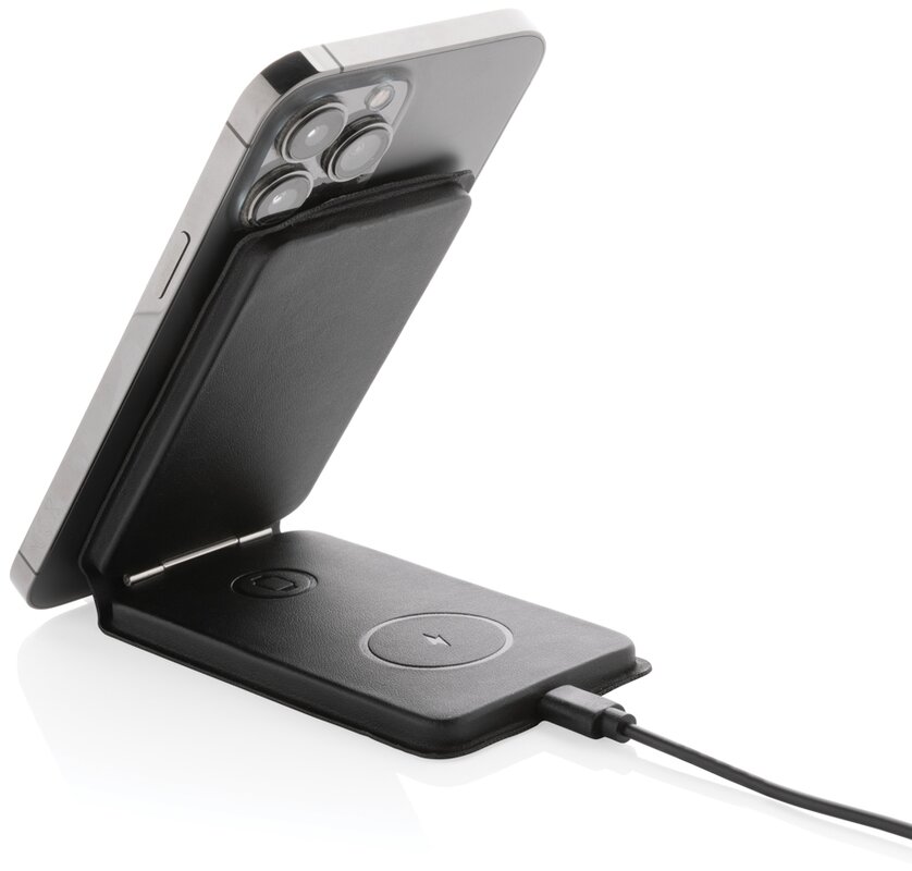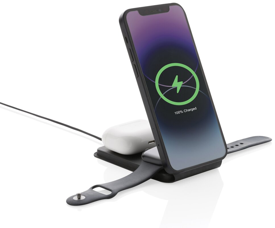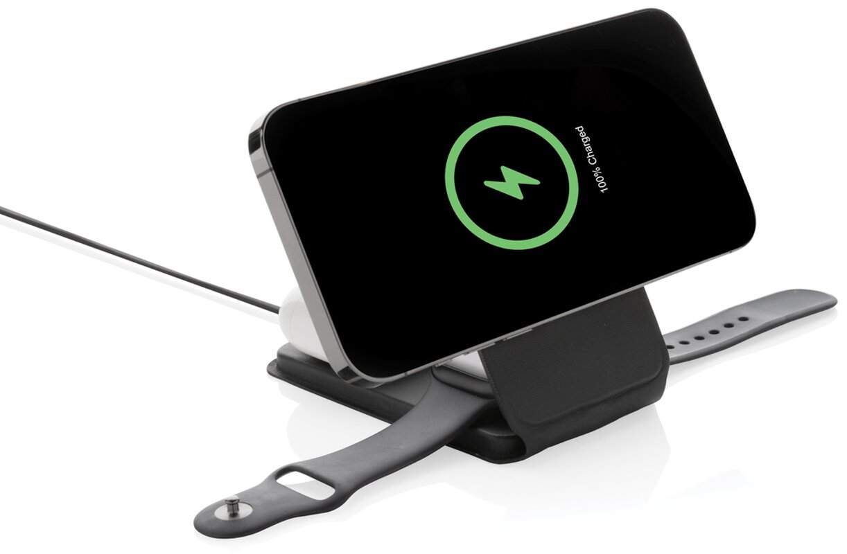 Luxusní skládací bezdrátová nabíječka 3 v 1. Je vybavená magnetickou 15W bezdrátovou nabíječkou pro telefon, 5W pro menší zařízení (např. nabíjecí krabička TWS sluchátek), 2,5W pro chytré hodinky Apple watch. Vyrobené z RCS recyklovaného PU. RCS (Recycled Claim Standard) je globální standard, který umožňuje ověřit použití recyklovaného materiálu v produktu napříč celým dodavatelským řetězcem. Celkový podíl recyklátu dle váhy produktu: 5 %. Včetně 120 cm nabíjecího kabelu z recyklovaného TPE. Výrobek je kompletně bez PVC. Baleno v FSC kraftové dárkové krabičce. Vstup: 9V/3A pro optimální použití. Výstup: telefon: 9V/1,1A, 9V/1,67A (15W); sluchátka: 5V/1A (5W); hodinky: 5V/0,5A (2,5W).