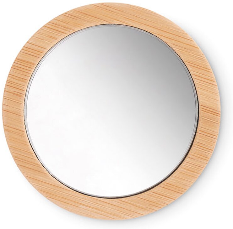 Kulaté bambusové jednostranné kosmetické zrcátko. Dodáváno v bavlněném pouzdře se stahovací šňůrkou.