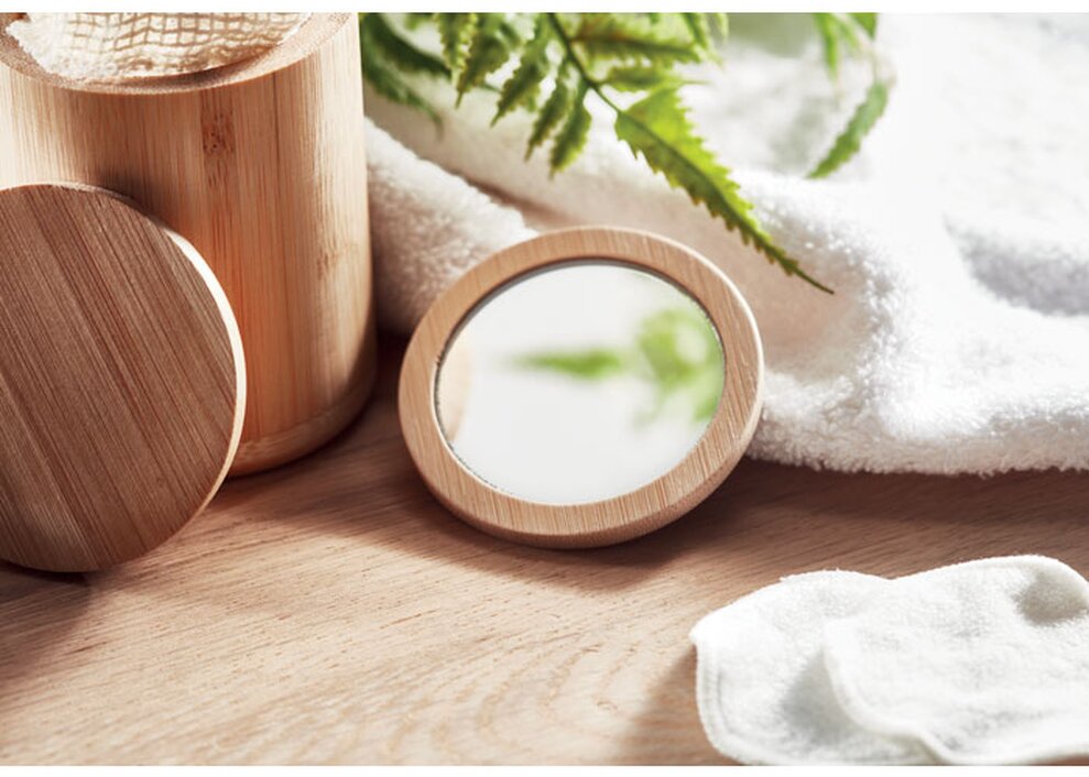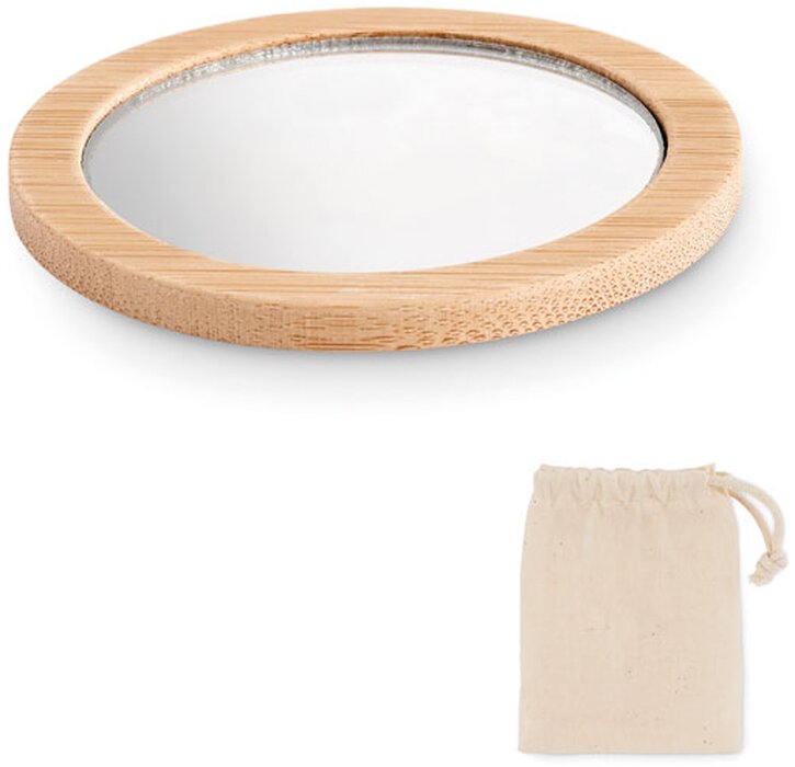 Kulaté bambusové jednostranné kosmetické zrcátko. Dodáváno v bavlněném pouzdře se stahovací šňůrkou.