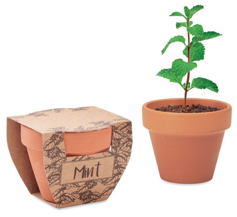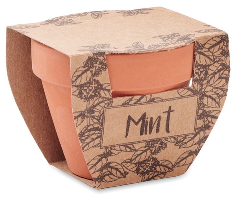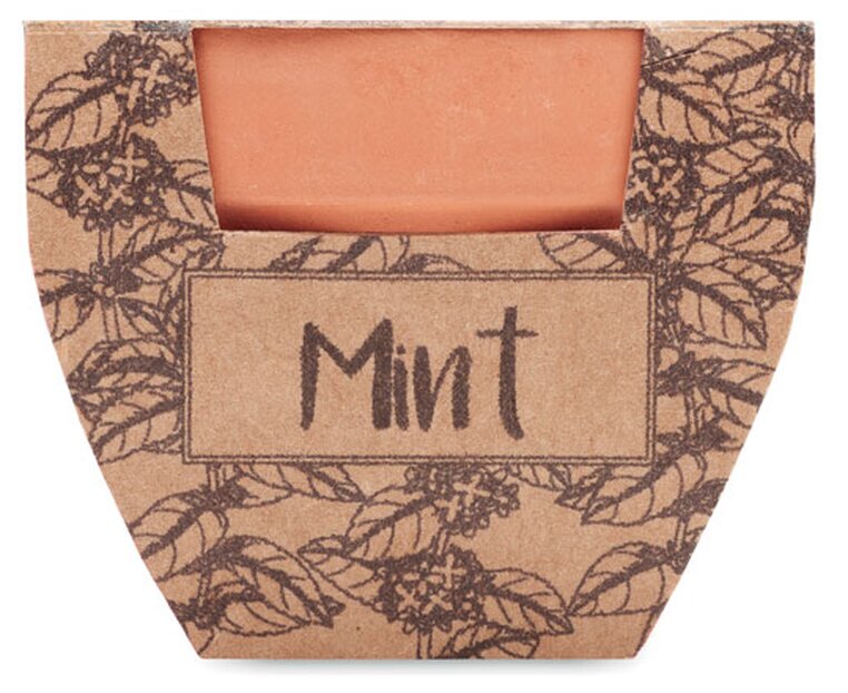 Malý hliněný květináč MINT POT se semínky máty a tabletou s půdou. Vyrobeno v EU.