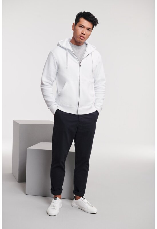 Pánská celorozepínací mikina má moderní rovný a užší střih s kapucí. Mikina má dále kvalitní YKK zip, stromečkovou vazbu kolem krku a otvor pro MP3 sluchátka. Šňůrky jsou ploché.