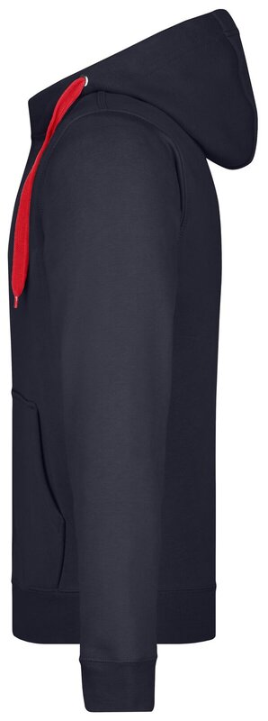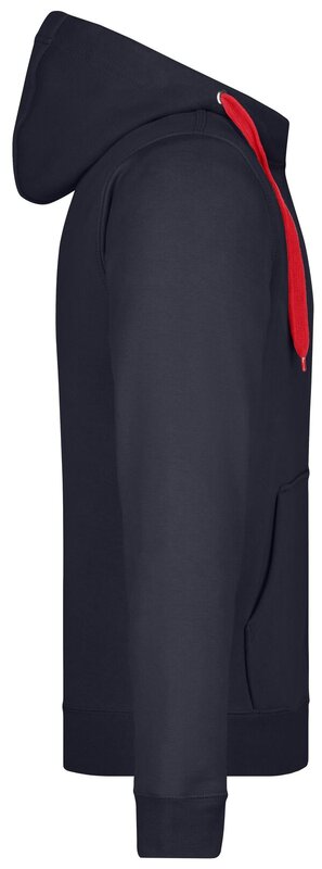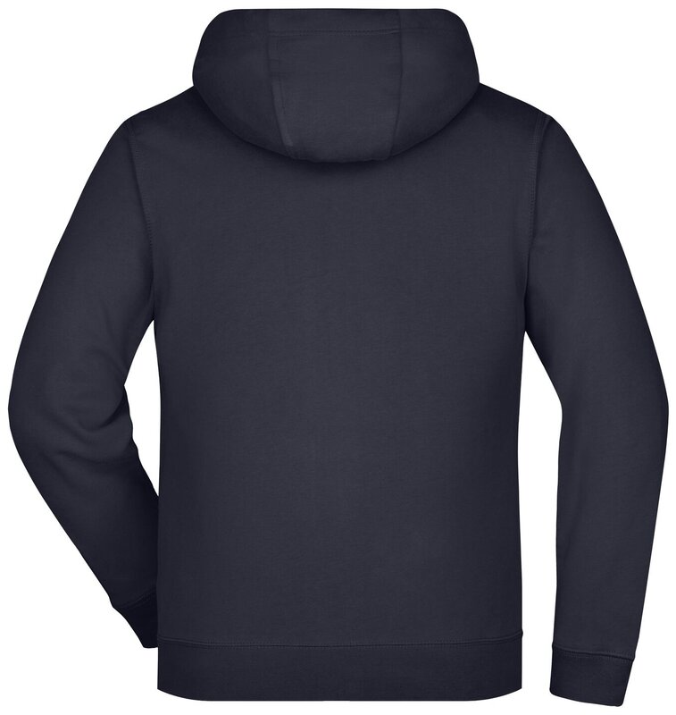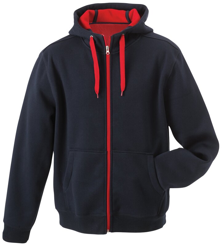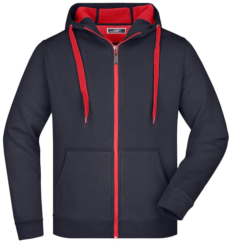 Pánská mikina James & Nicholson s kapucí. Vnější materiál: 100% bavlna. Podšívka: 100% polyester. Mikina je na zip, má šňůrky a vnitřek v kontrastní barvě. Kapuce s ochranou brady. Rukávy a pas s elastanem. Klokaní kapsa. Mikina má ploché švy. Hmotnost: 380 g/m². Balení: 1/25 (ks v jednom sáčku / celkem ks v kartonu).