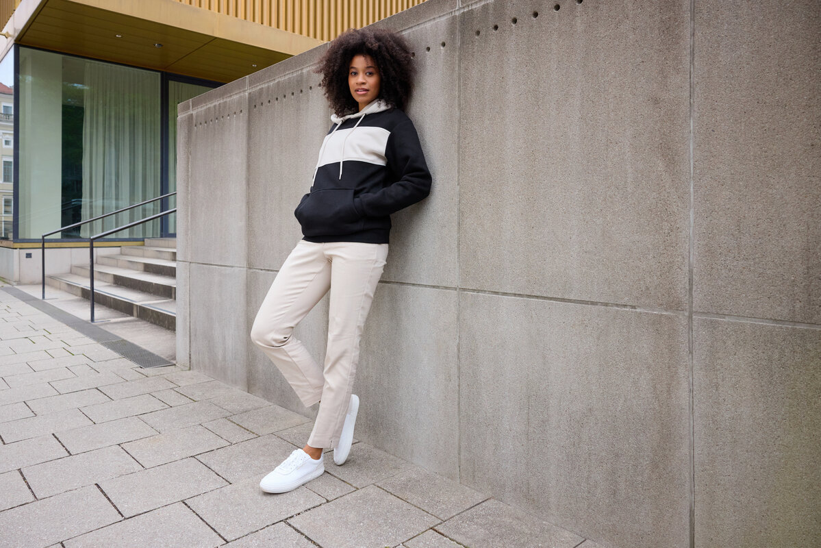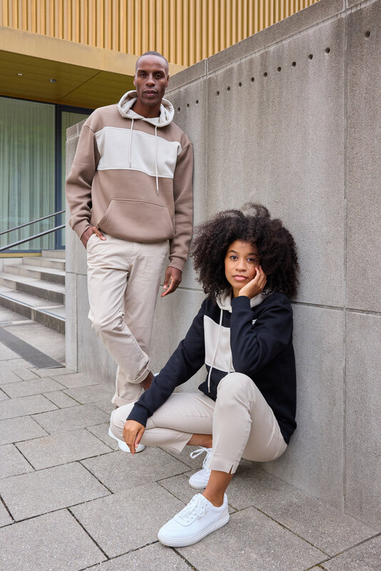 Unisex mikina ve stylu klokanky se širokým kontrastním pruhem z kvalitní kombinace bio bavlny a recyklovaného polyesteru.