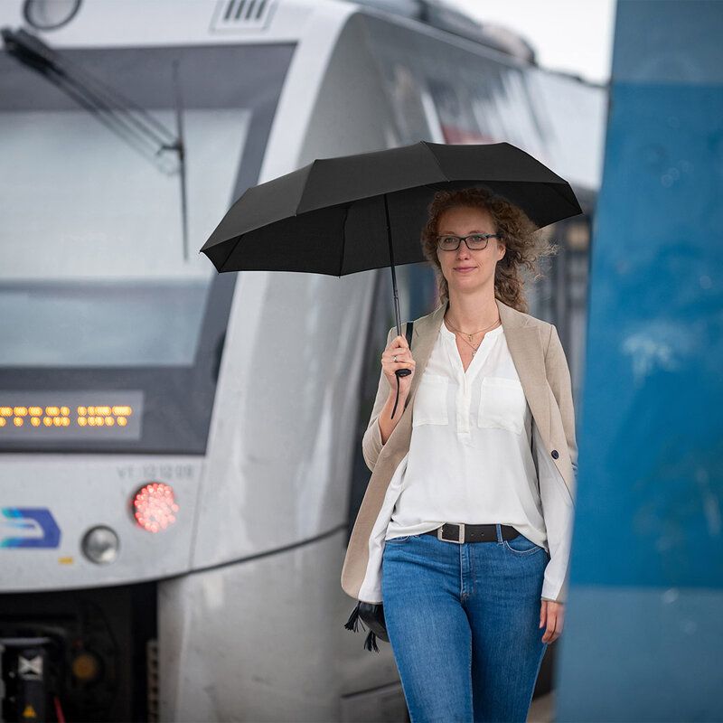 Skvělý malý deštník, který můžete vzít díky jeho složitelnosti opravdu kamkoliv. Vzhledem ke své stabilitě je vhodný i do větrného počasí. Plastová rukojeť vám zajistí pohodlí při přenosu deštníku. Průměr: 98 cm