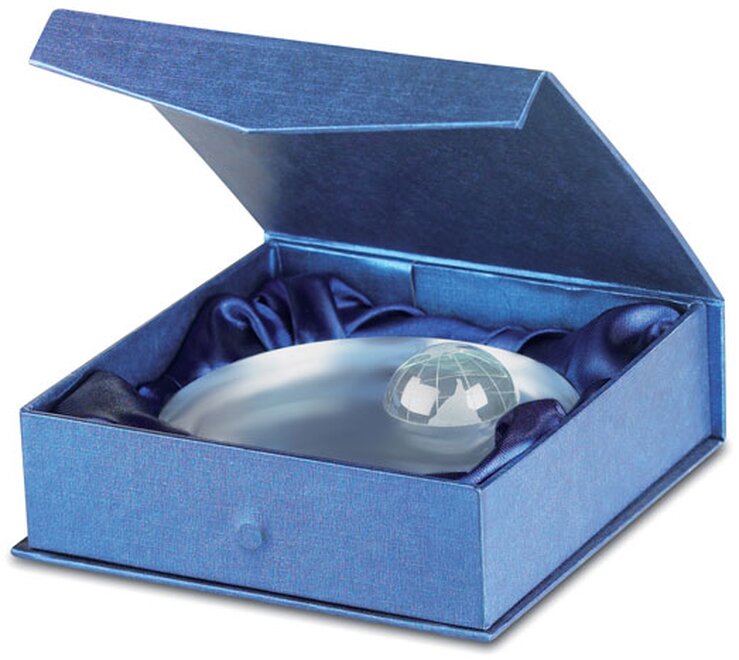 Skleněná kulatá trofej v horní části zdobená zeměkoulí. Dodáváno v dárkové krabičce.