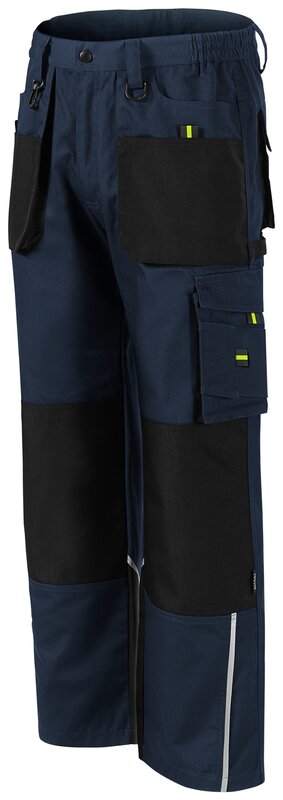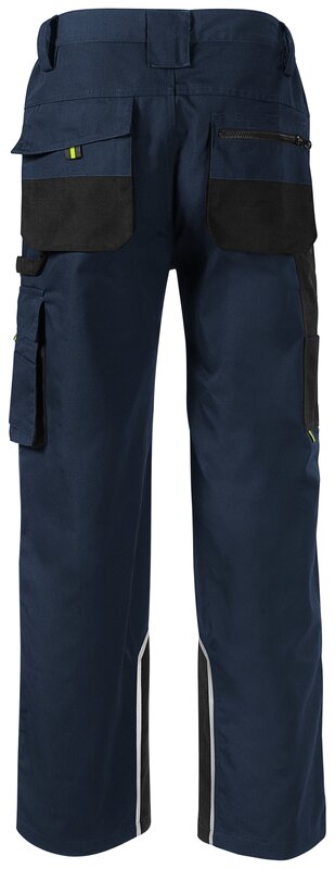 Pánské pracovní montérky s retroreflexní páskou v dolní části nohavic. Multifunkční kapsy. Pruženka v boční části pasového límce kalhot. Zdvojená kolena pro zvýšení odolnosti. Poutko na kladivo. CORDURA® použita v kontrastní barvě.