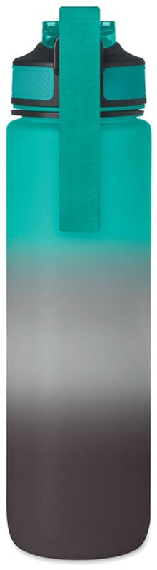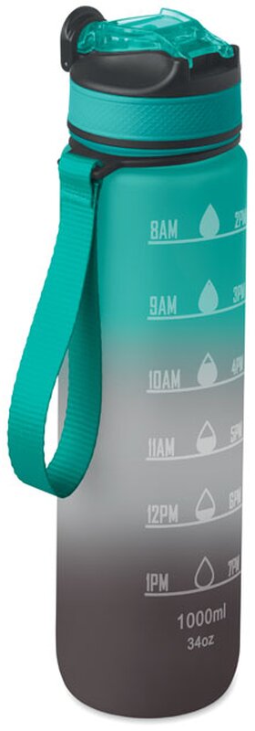 Sportovní RPET láhev na vodu s integrovaným brčkem, měkkým silikonovým náustkem, motivačním časovým značením, víčkem otevíratelným jednou rukou, bezpečnostním zámkem a popruhem na přenášení. Objem 1 l.