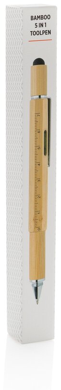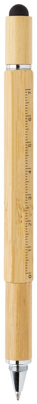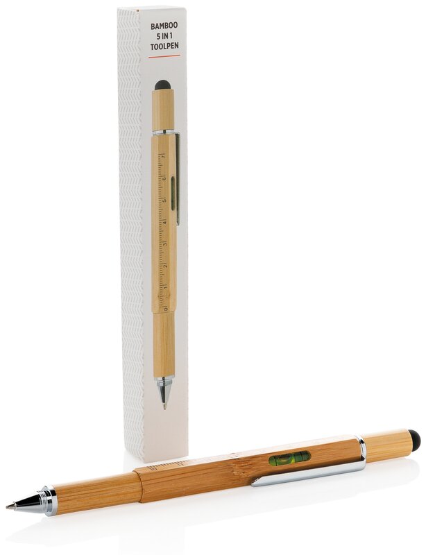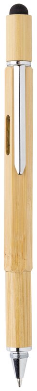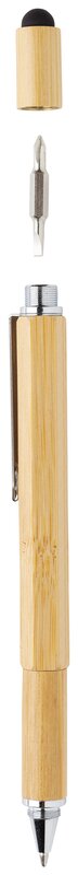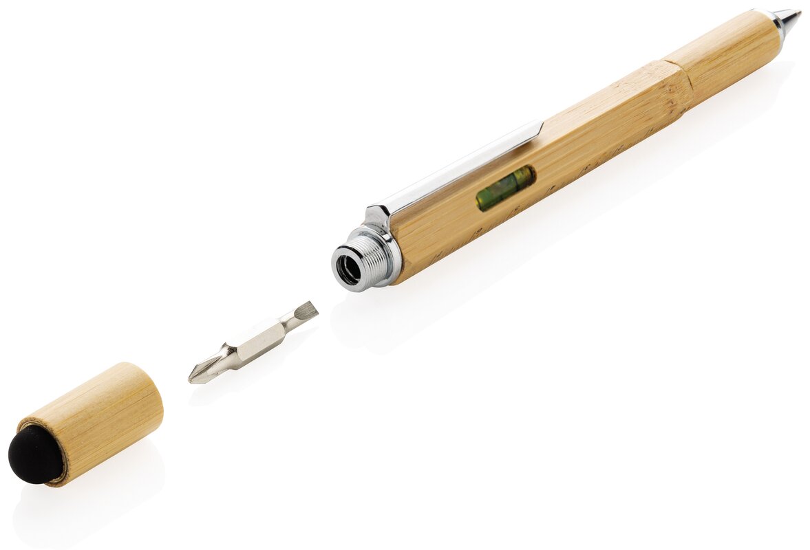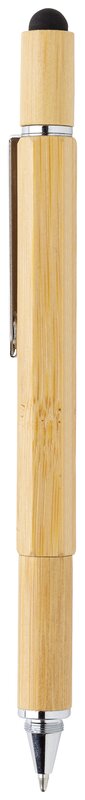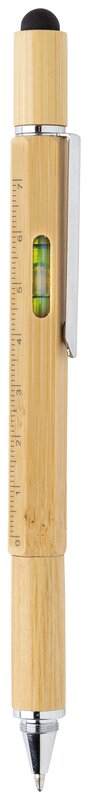 Multifunkční bambusové pero s pravítkem (7 cm), vodováhou, šroubovákem, stylusem či kuličkovým perem s modrým inkoustem pro psaní až 400 m textu. Vyrobeno z bambusu, klip z hliníku.