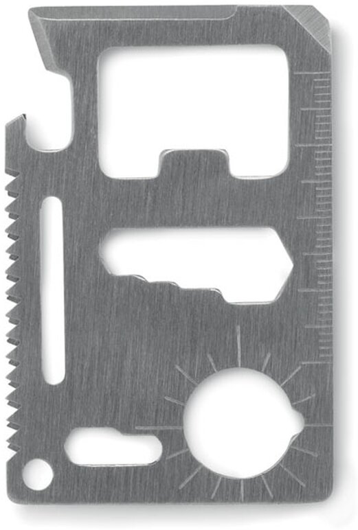 Praktická multifunkční karta s 9 nástroji - otvírák na konzervy, měřítko v cm, otvírák lahví, 2 šestihrany na šrouby nebo matice, nástroj na křídlaté šrouby, pilka, břit nože, šroubovák, indikátor nouzového určení směru. Dodáváno v konžekovém obalu. Perfektní dárek pro muže jakéhokoliv věku či oboru.