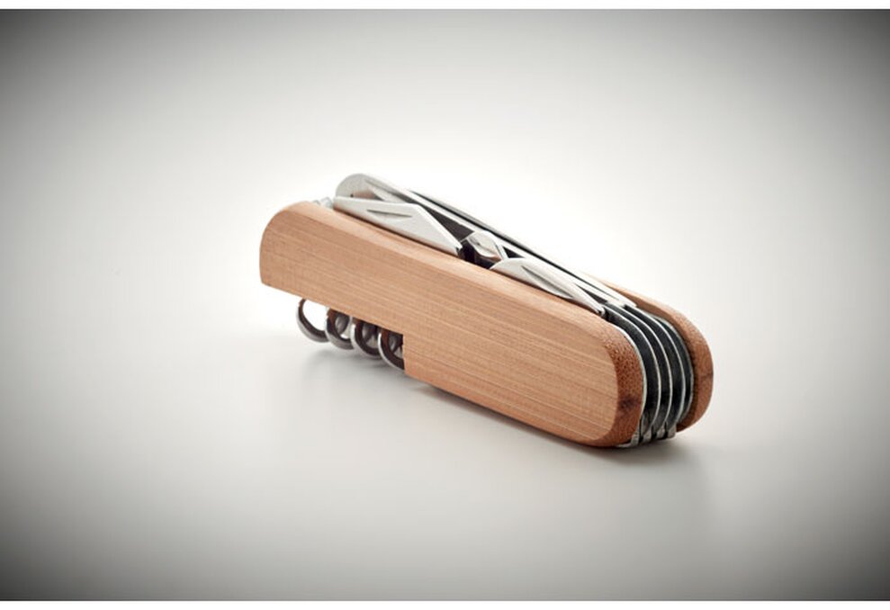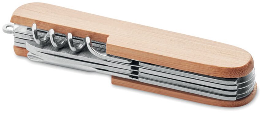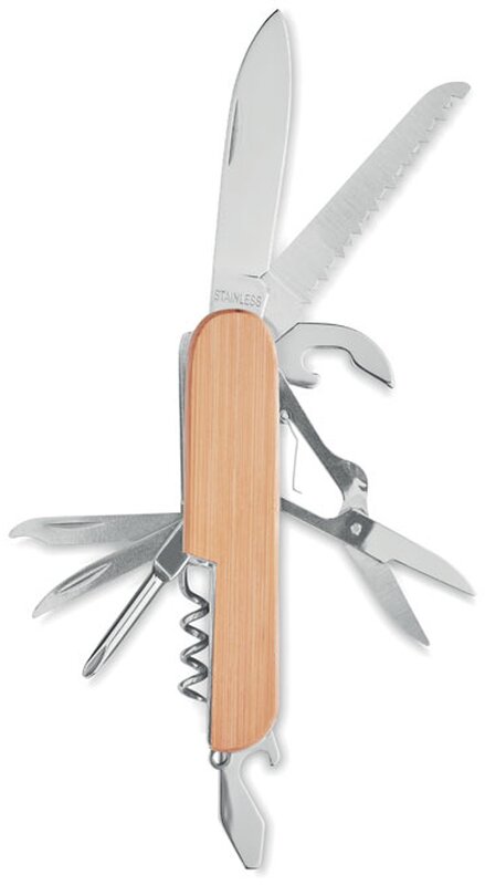 Praktický multifunkční nůž s bambusovým povrchem. Obsahuje 9 funkcí. Bambus je přírodní materiál, barevnost a povrch jednotlivých produktů se může lišit.