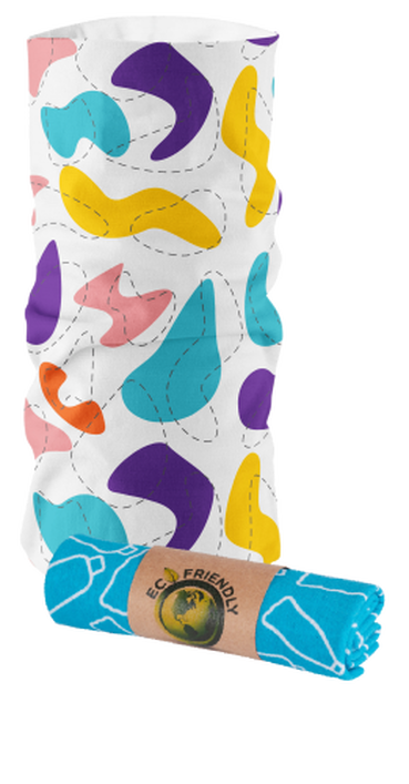 Multifunkční nákrčník vyrobený ze 100% recyklovaného polyesteru s papírovým přebalem vyrobeným z recyklovaného papíru.
