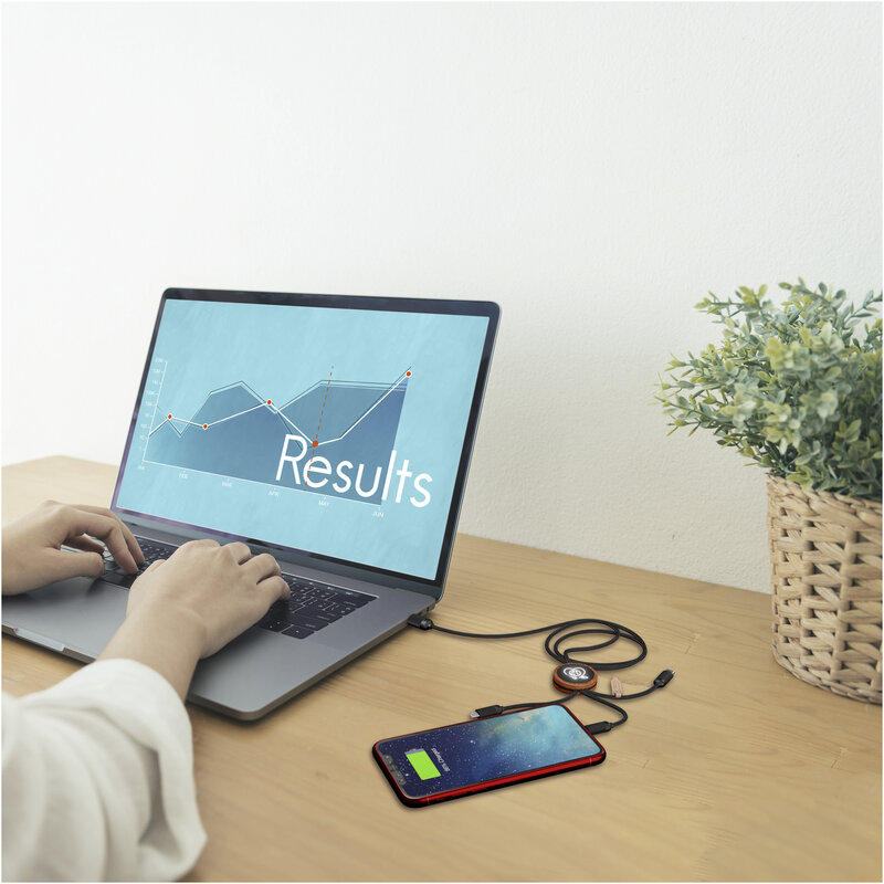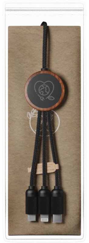 Vyrobený z bambusu a recyklovaného PET plastu se třemi výstupními konektory (USB-C, Android, iPhone) + delší USB konektor.