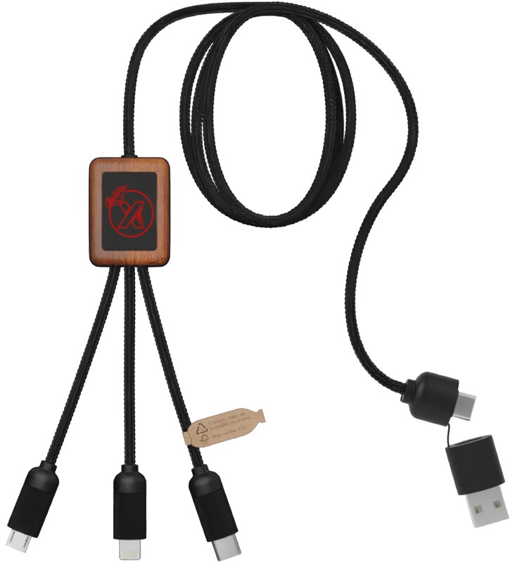 Nabíjecí kabel 5v1 z rPET se svítícím logem a hranatým dřevěným pouzdrem, SCX.design C38 028.978