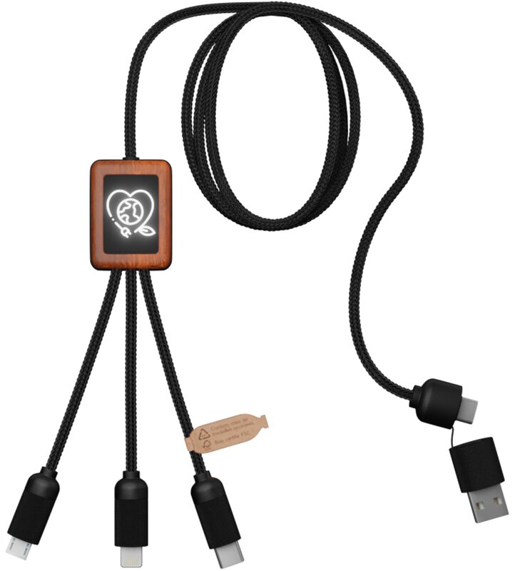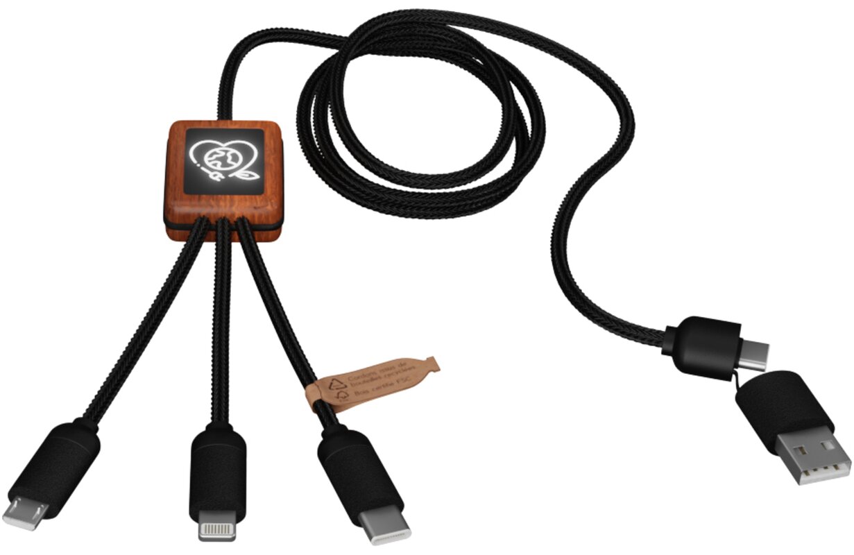 Nabíjecí kabel 5v1 z rPET se svítícím logem a hranatým dřevěným pouzdrem, SCX.design C38 Černo-dřevěná 028.978