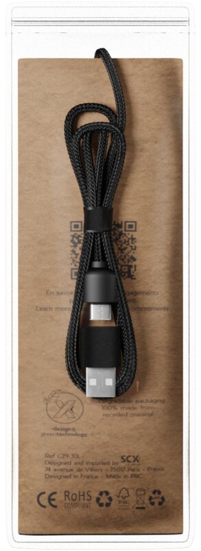Kabel je vyrobený z recyklovaného PET plastu a obal z recyklovaného papíru.