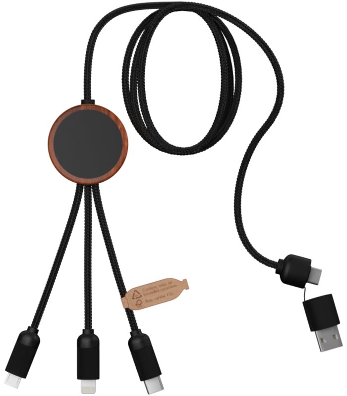 Nabíjecí kabel 5v1 z rPET se svítícím logem a kulatým dřevěným pouzdrem, SCX.design C37 Dřevěná 028.979