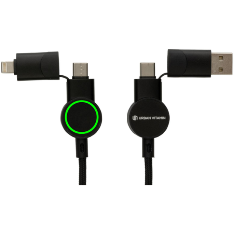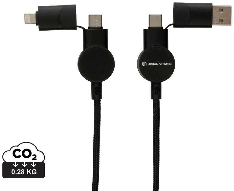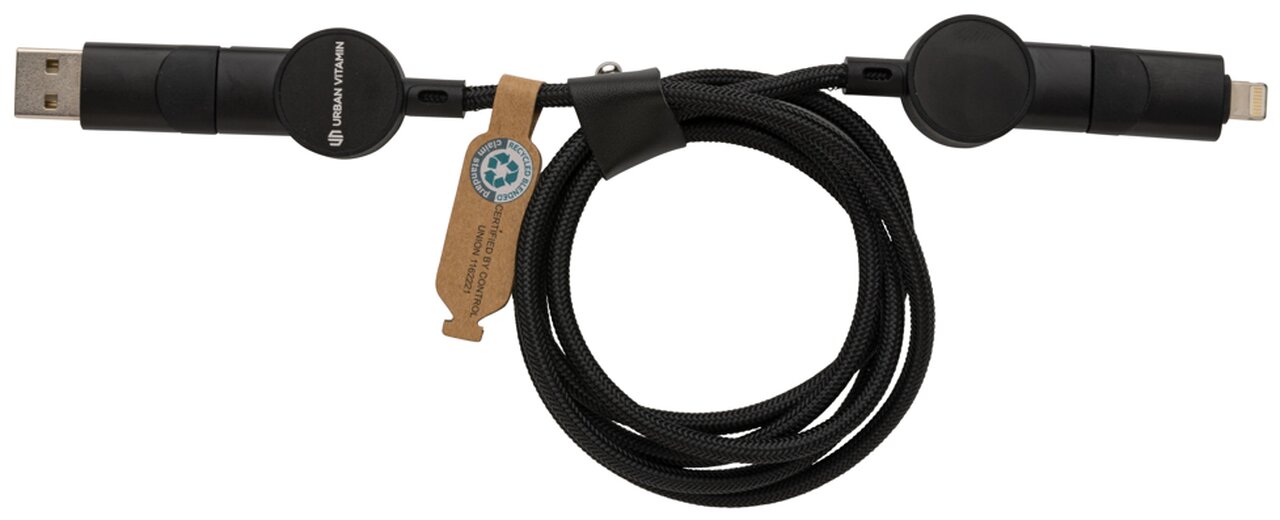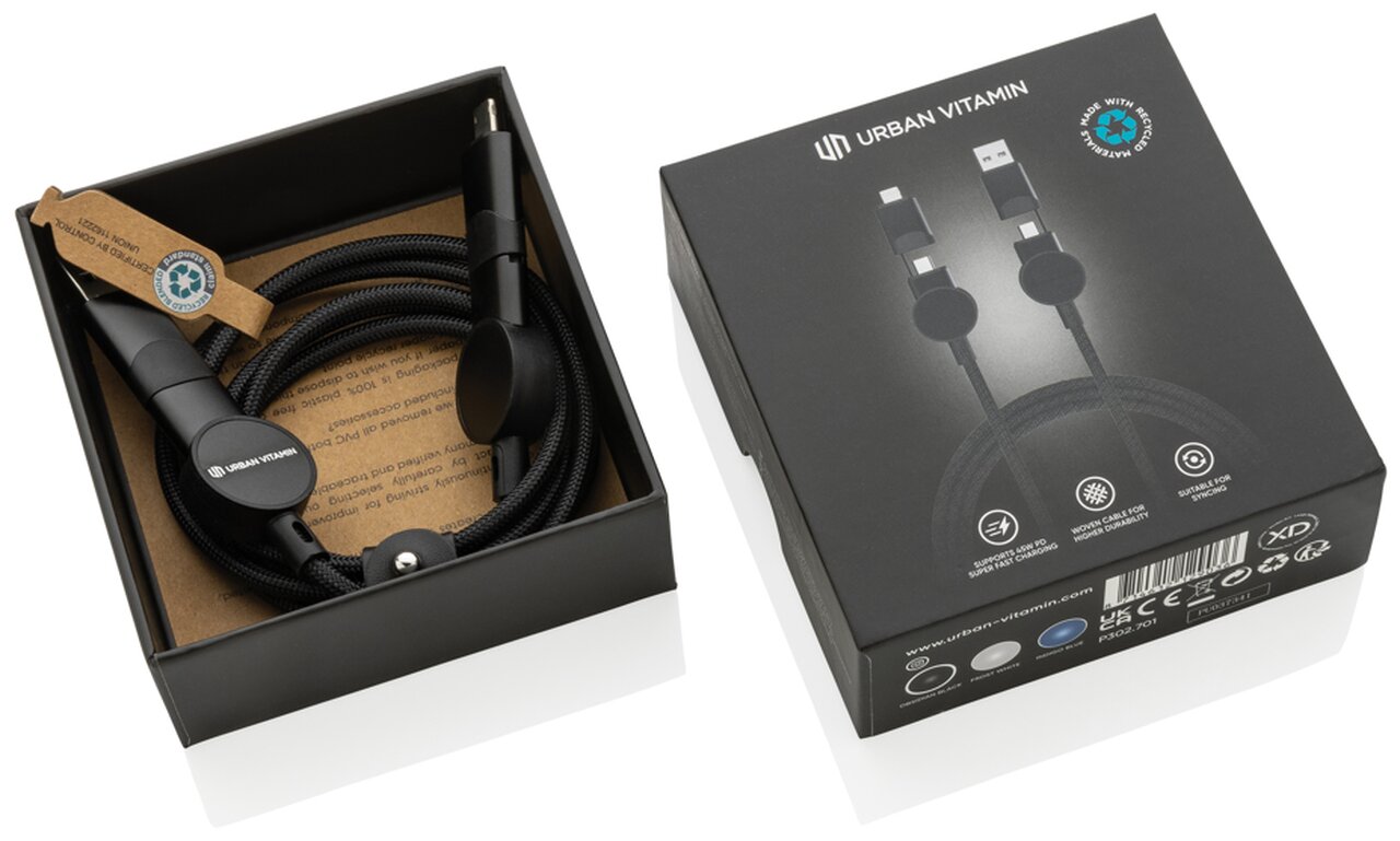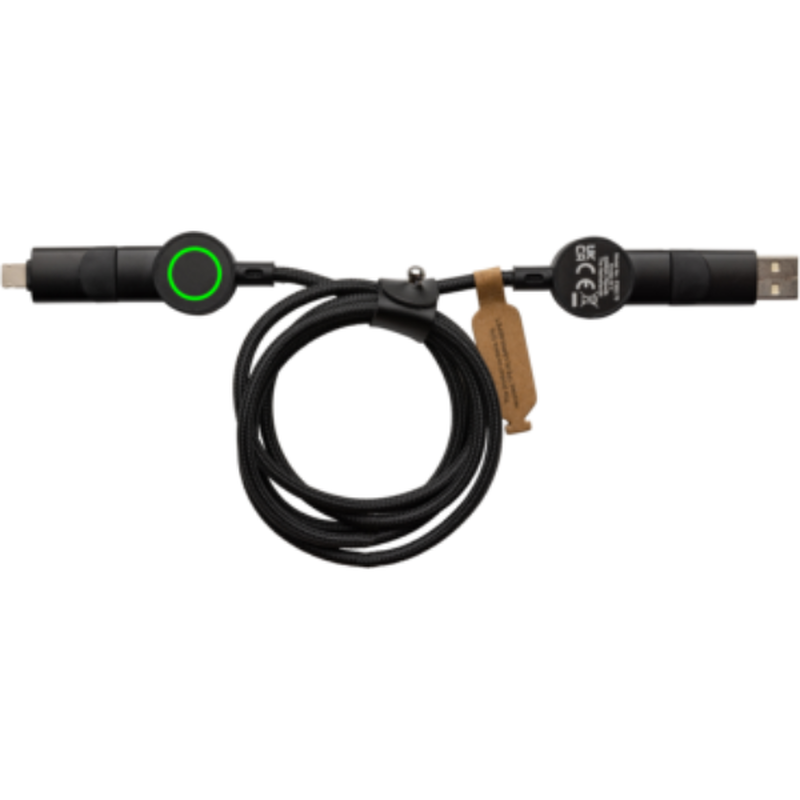 Nabíjecí kabel 6 v 1, jenž umožňuje nabíjení maximální rychlostí až do výkonu 45 W. Obashuje pouzdro vyrobené z recyklovaného TPE plastu s RCS certifikací, vnitřní část kabelu z recyklovaného TPE, vnější část z recyklovaného PET. Podíl použitého recyklovaného materiálu vzhledem k celkové váze produktu: 52 %. Kabel disponuje 5 konektory: USB C/USB A vstup, USB C/micro USB/iOS výstup. USB C je vhodné pro nabíjení moderních telefonů, ale i MacBooků. USB A má dvojí funkci (vstup i výstup) pro nabíjení jakéhokoliv zařízení z jakéhokoliv jiného zdroje. Produkt je vyroben kompletně bez PVC. Max výkon USB C do Lightning: 18W, max výkon USB C do USB C: 45W. Délka: 120 cm. Podporuje nabíjení i přenos dat.