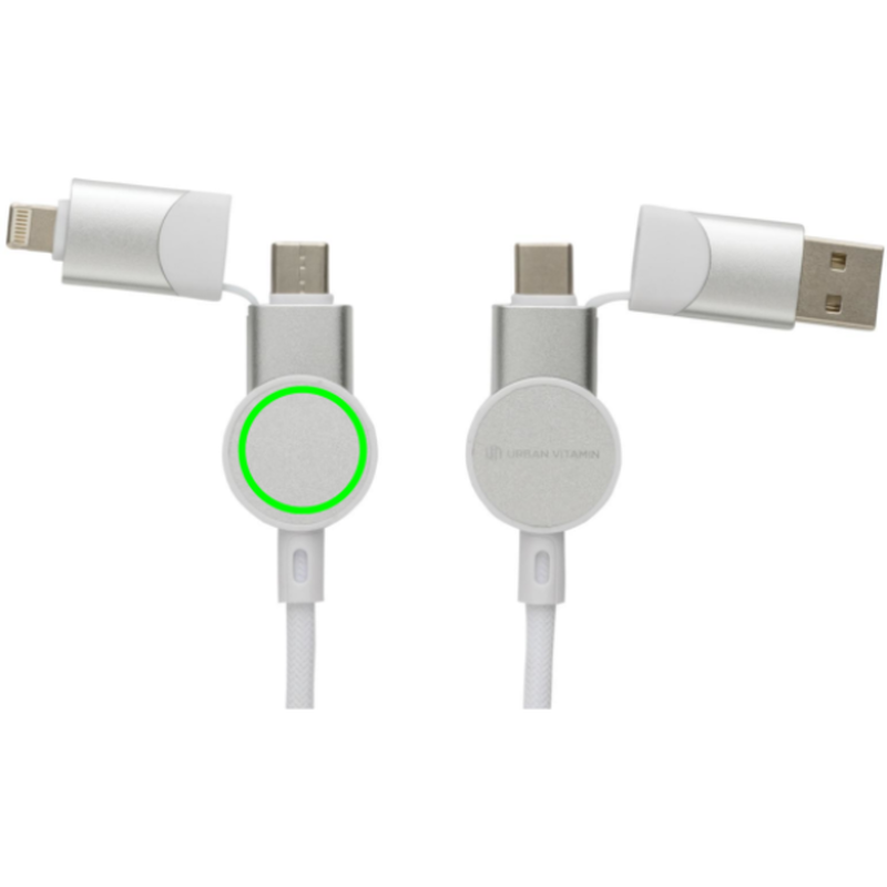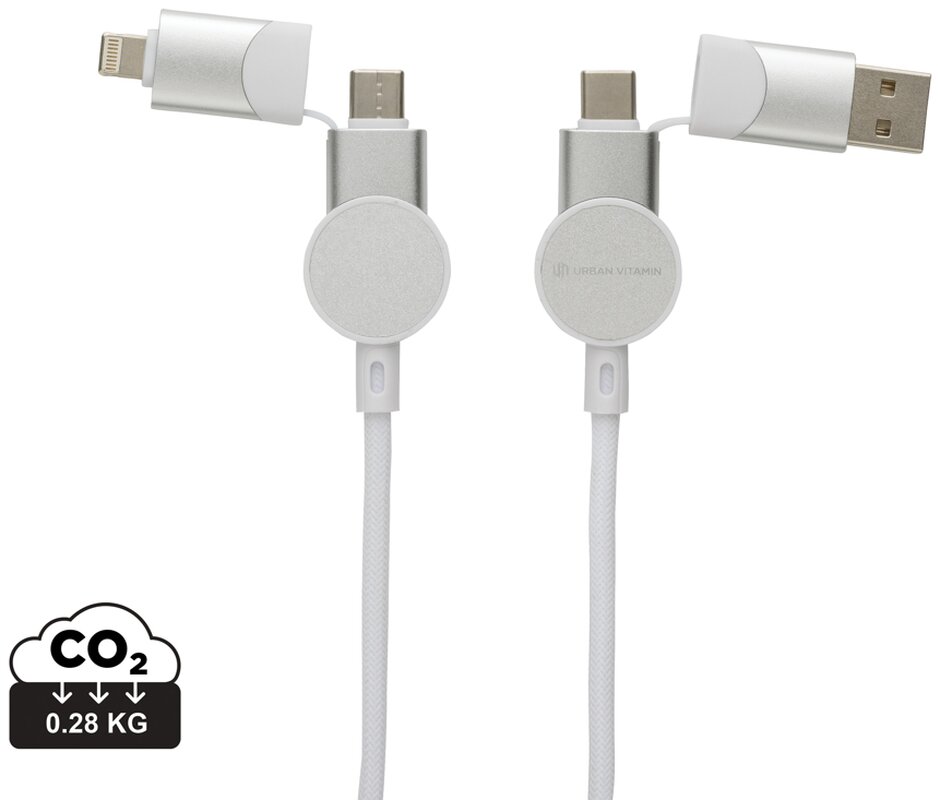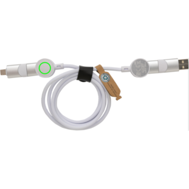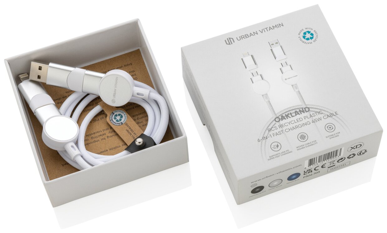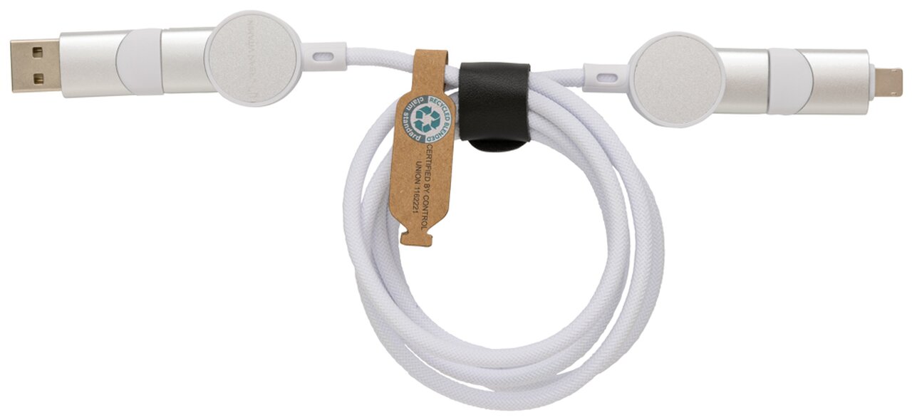 Nabíjecí kabel 6 v 1, jenž umožňuje nabíjení maximální rychlostí až do výkonu 45 W. Obashuje pouzdro vyrobené z recyklovaného TPE plastu s RCS certifikací, vnitřní část kabelu z recyklovaného TPE, vnější část z recyklovaného PET. Podíl použitého recyklovaného materiálu vzhledem k celkové váze produktu: 52 %. Kabel disponuje 5 konektory: USB C/USB A vstup, USB C/micro USB/iOS výstup. USB C je vhodné pro nabíjení moderních telefonů, ale i MacBooků. USB A má dvojí funkci (vstup i výstup) pro nabíjení jakéhokoliv zařízení z jakéhokoliv jiného zdroje. Produkt je vyroben kompletně bez PVC. Max výkon USB C do Lightning: 18W, max výkon USB C do USB C: 45W. Délka: 120 cm. Podporuje nabíjení i přenos dat.