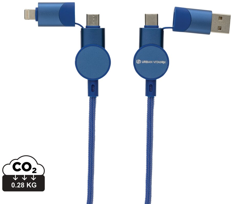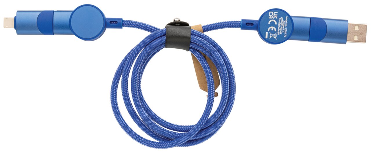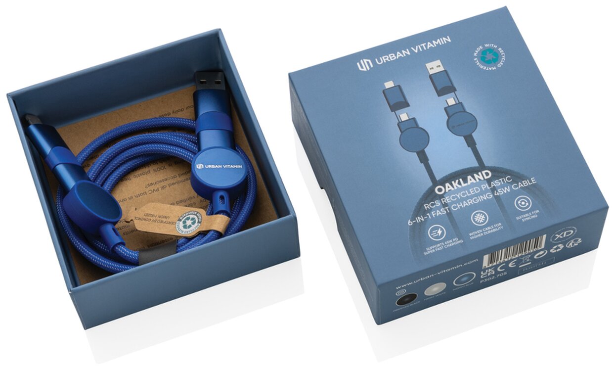 Nabíjecí kabel 6 v 1, jenž umožňuje nabíjení maximální rychlostí až do výkonu 45 W. Obashuje pouzdro vyrobené z recyklovaného TPE plastu s RCS certifikací, vnitřní část kabelu z recyklovaného TPE, vnější část z recyklovaného PET. Podíl použitého recyklovaného materiálu vzhledem k celkové váze produktu: 52 %. Kabel disponuje 5 konektory: USB C/USB A vstup, USB C/micro USB/iOS výstup. USB C je vhodné pro nabíjení moderních telefonů, ale i MacBooků. USB A má dvojí funkci (vstup i výstup) pro nabíjení jakéhokoliv zařízení z jakéhokoliv jiného zdroje. Produkt je vyroben kompletně bez PVC. Max výkon USB C do Lightning: 18W, max výkon USB C do USB C: 45W. Délka: 120 cm. Podporuje nabíjení i přenos dat.