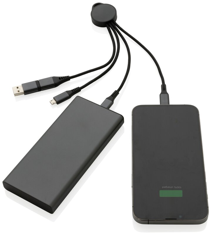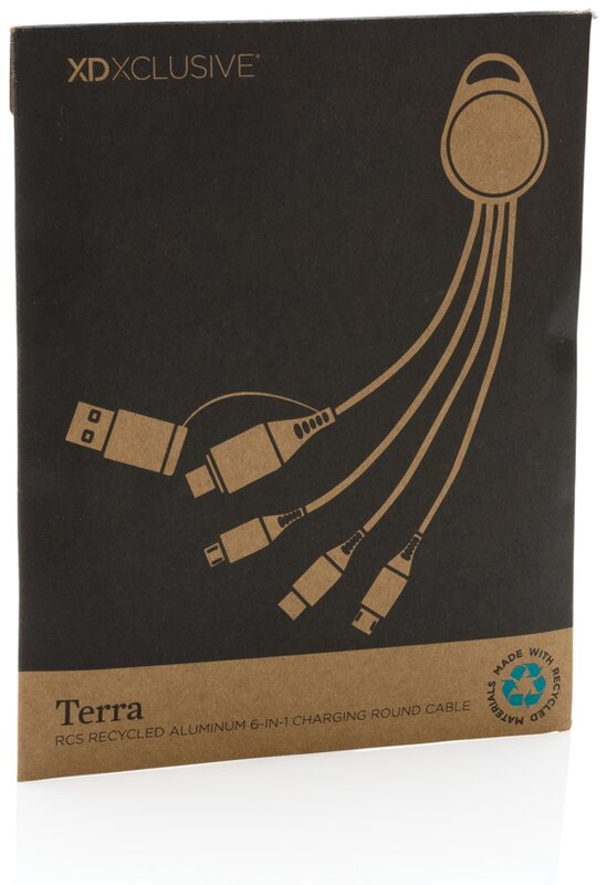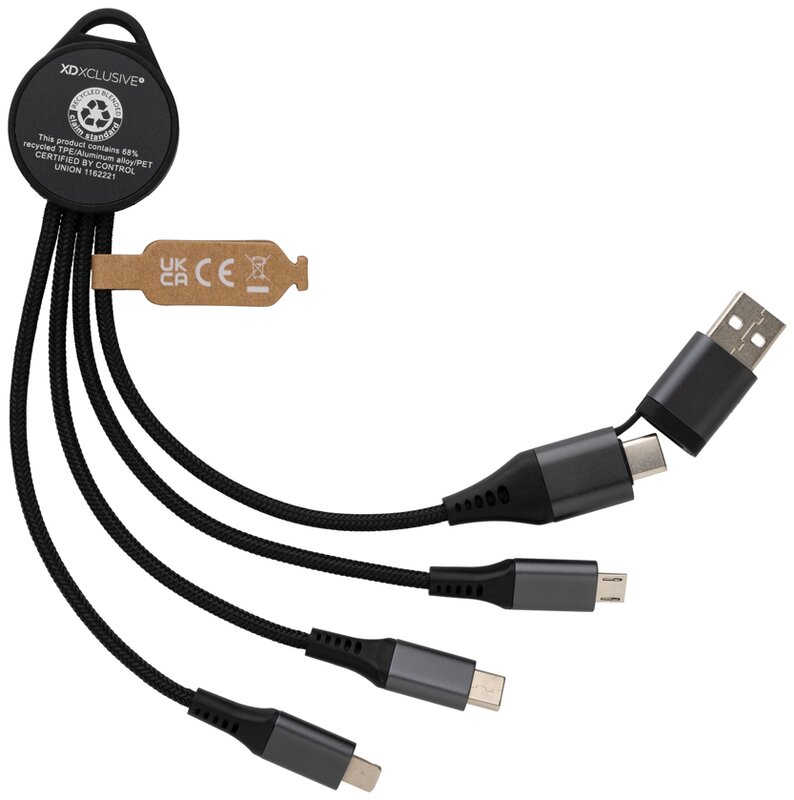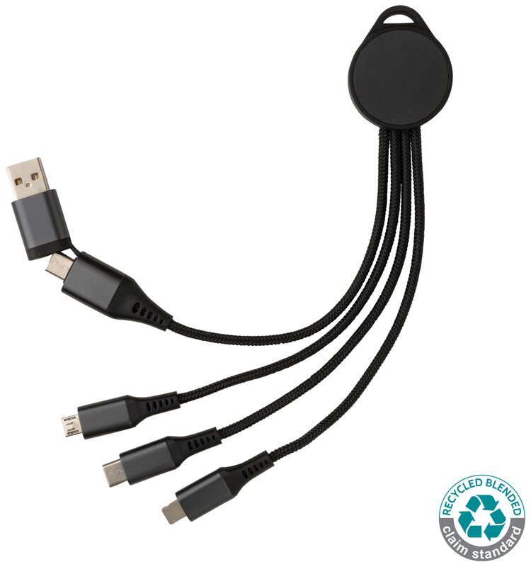 Nabíjecí kabel 6 v 1 vyrobený z RCS recyklovaného hliníku, recyklovaného TPE a recyklovaného PET. RCS (Recycled Claim Standard) je globální standard, který umožňuje ověřit použití recyklovaného materiálu v produktu napříč celým dodavatelským řetězcem. Podíl použitého recyklovaného materiálu vzhledem k celkové váze produktu: 68 %. Hliník při recyklaci neztrácí své vlastnosti, lze tak recyklovat opakovaně. Kabel disponuje 5 konektory: USB C/USB A vstup, USB C/micro USB/iOS výstup. USB C je vhodné pro nabíjení moderních telefonů, ale i MacBooků. USB A má dvojí funkci (vstup i výstup) pro nabíjení jakéhokoliv zařízení z jakéhokoliv jiného zdroje. PET opletené kabely délky 12 cm. Vodné pro nabíjení i přenos dat. Podporuje rychlonabíjení 9V/2A. Baleno v FSC® dárkovém balení.