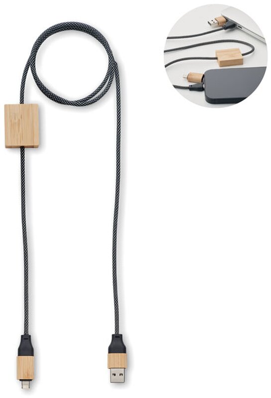 Nabíjecí kabel 60W z RPET materiálu s bambusovými detaily.