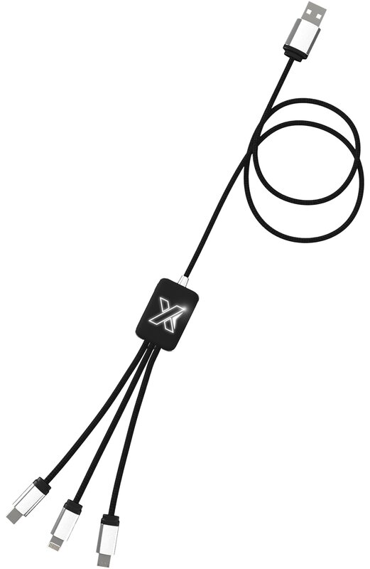 Nabíjecí kabel na kterém je logo po vygravírování světelně podbarvené bílou, modrou nebo červenou barvou.