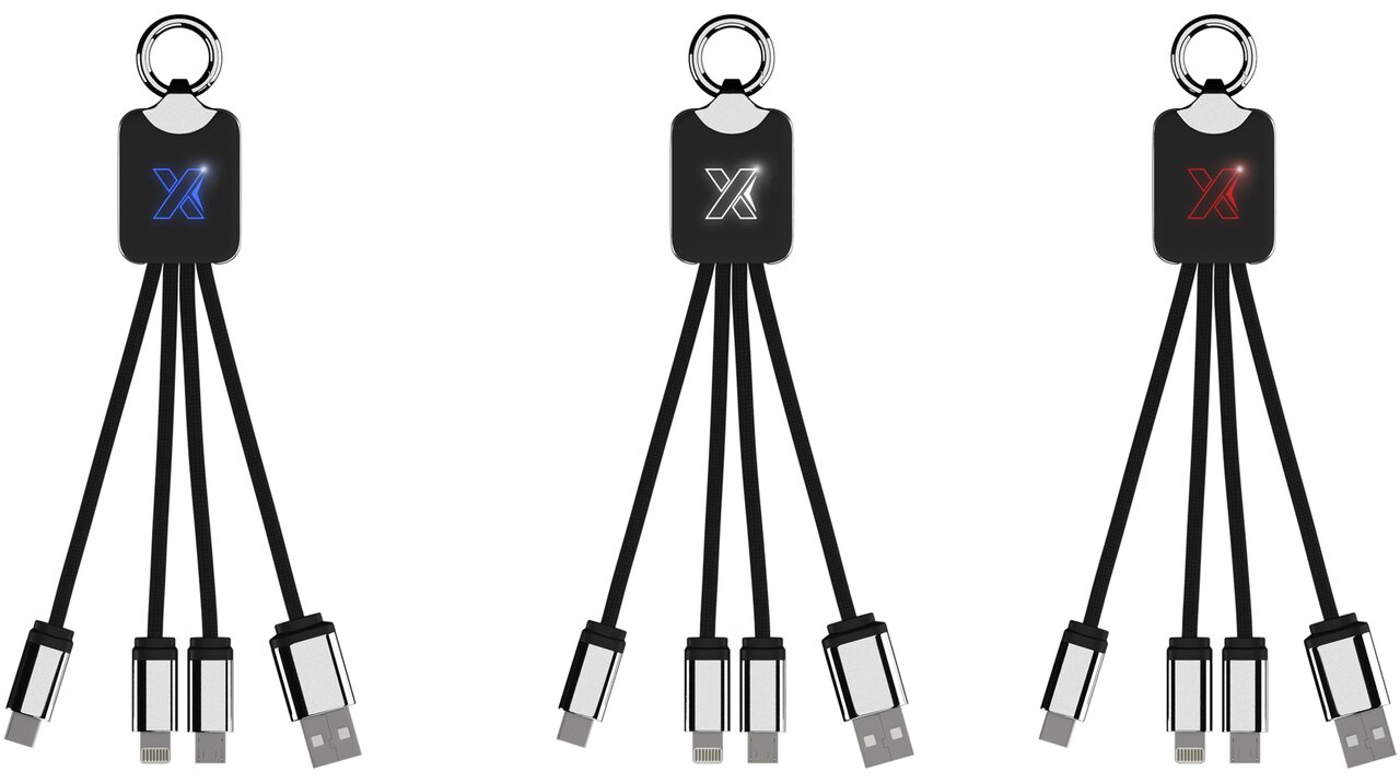 Nabíjecí kabel na kterém je logo po vygravírování světelně podbarvené bílou, modrou nebo červenou barvou.