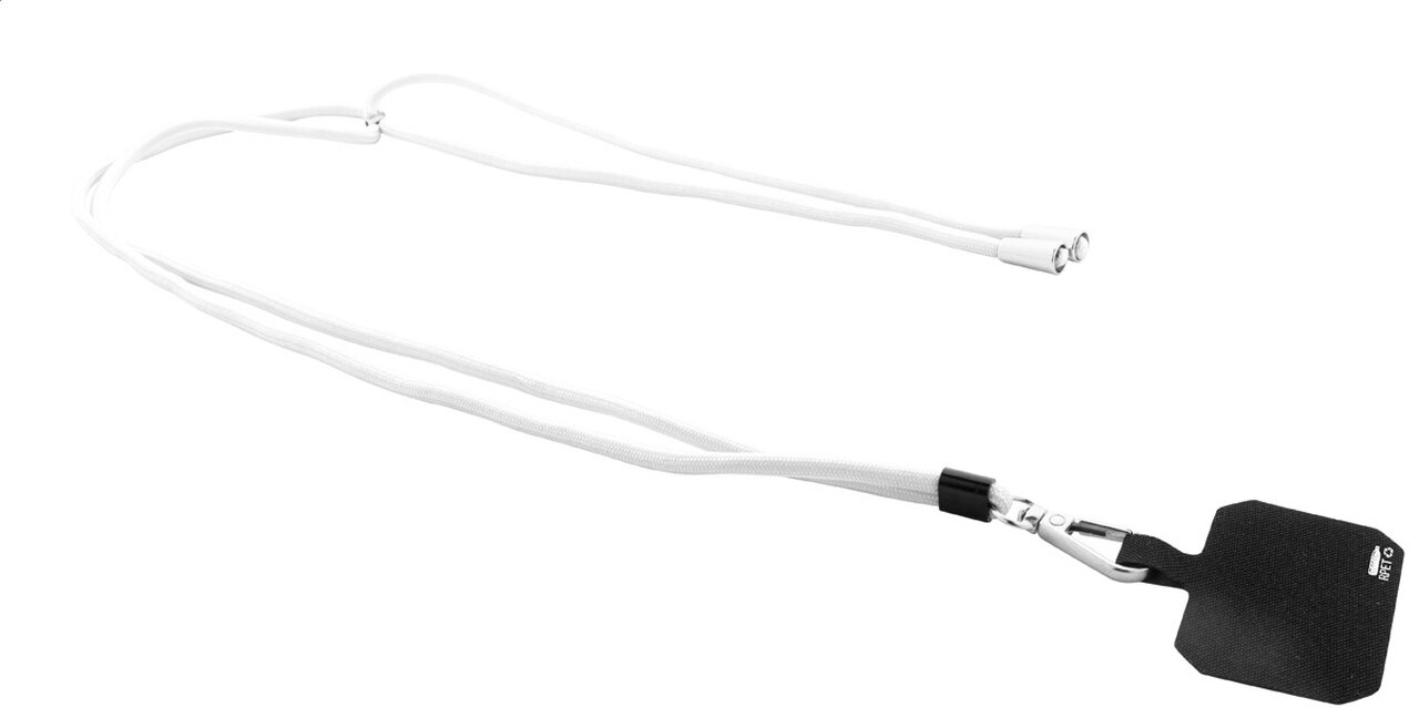 Nastavitelná crossbody šnůrka na mobil z ekologického RPET materiálu, ideální pro firemní potisk. Kovová karabina a textilní vložka do krytu telefonu zajišťují bezpečné připevnění telefonu. Nastavitelná délka umožňuje pohodlné nošení přes rameno nebo kolem krku. Perfektní pro handsfree používání telefonu při akcích, festivalech nebo každodenním nošení.