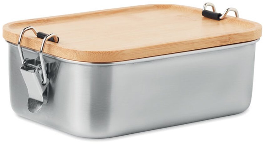 Obědová krabička z nerezové oceli s bočními zapínacími sponami a bambusovým víkem. Objem 750 ml.