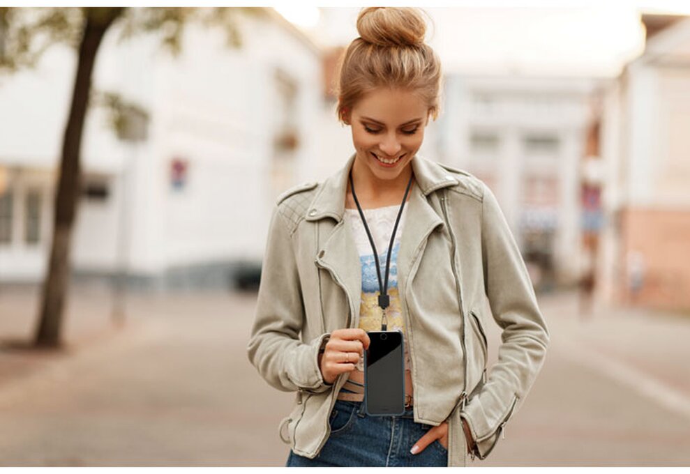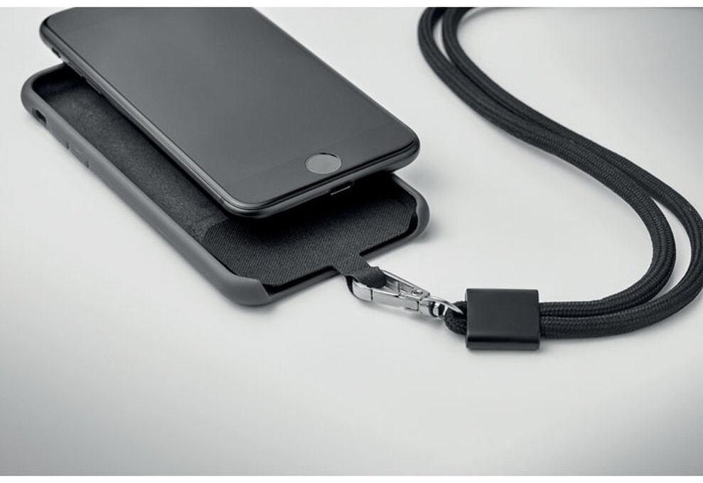 Crossbody šňůrka na telefon z RPET (recyklované pet lahve) s kartou pro vložení pod obal telefonu.
