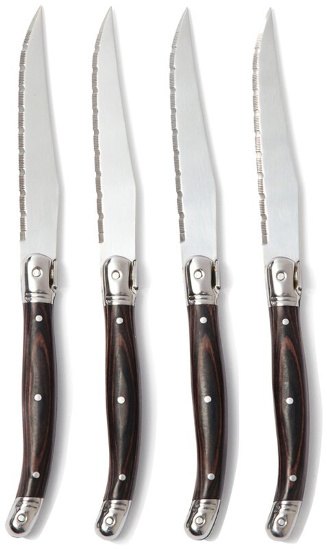 Vysoce kvalitní nože na maso v unikátním bistro stylu inspirovaném Francií. Rukojeť z černého dřeva pakka a čepele z vysoce kvalitní nerezové oceli zajišťují pohodlí a kvalitu řezu. Čepel má jemné zoubky, což vám umožní krájet potraviny s minimálním odporem. Sada čtyř nožů, které můžete snadno sladit s domácími vidličkami. Baleno v exkluzivní dárkové krabičce.