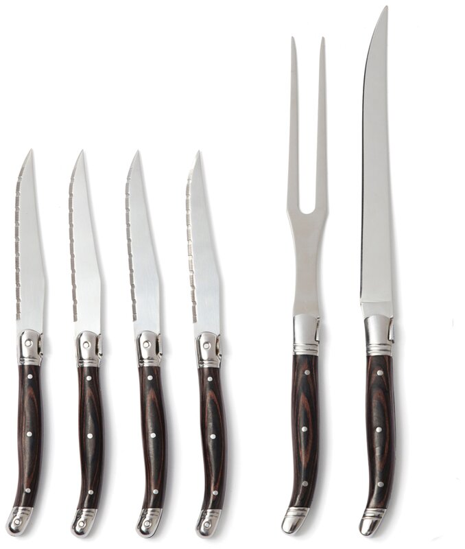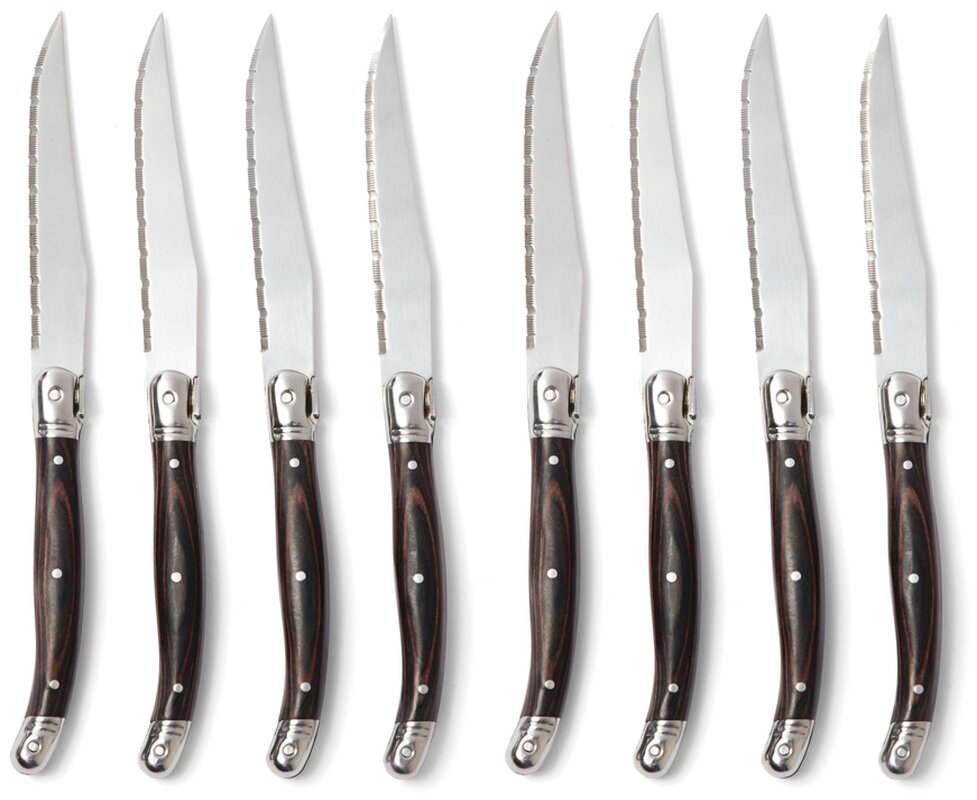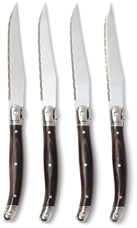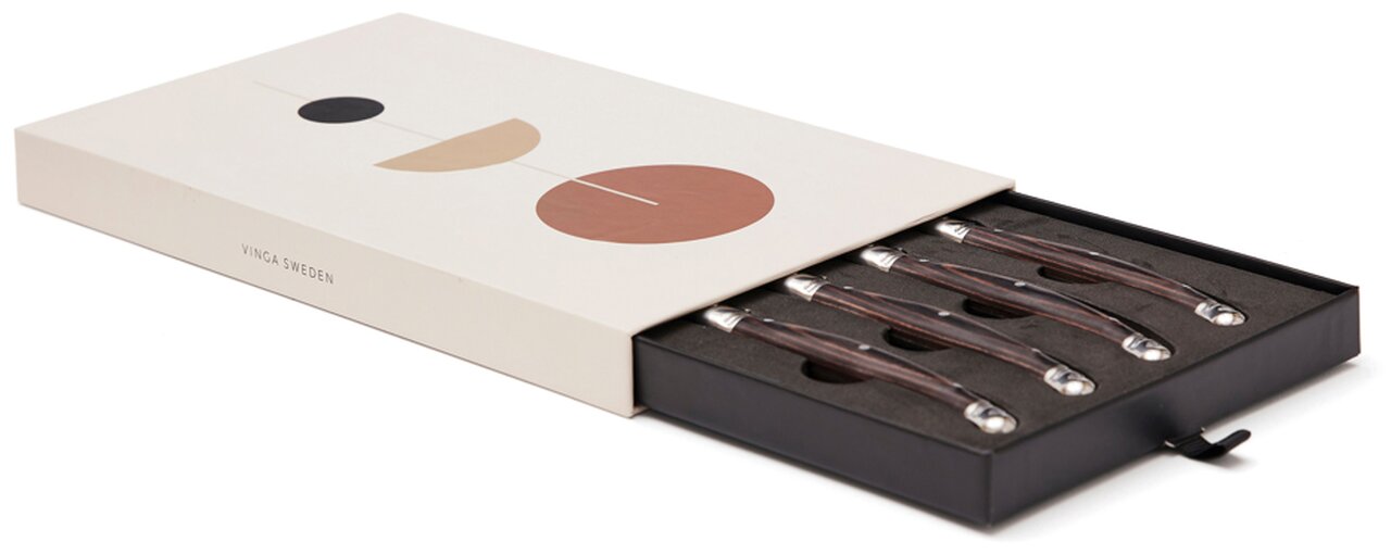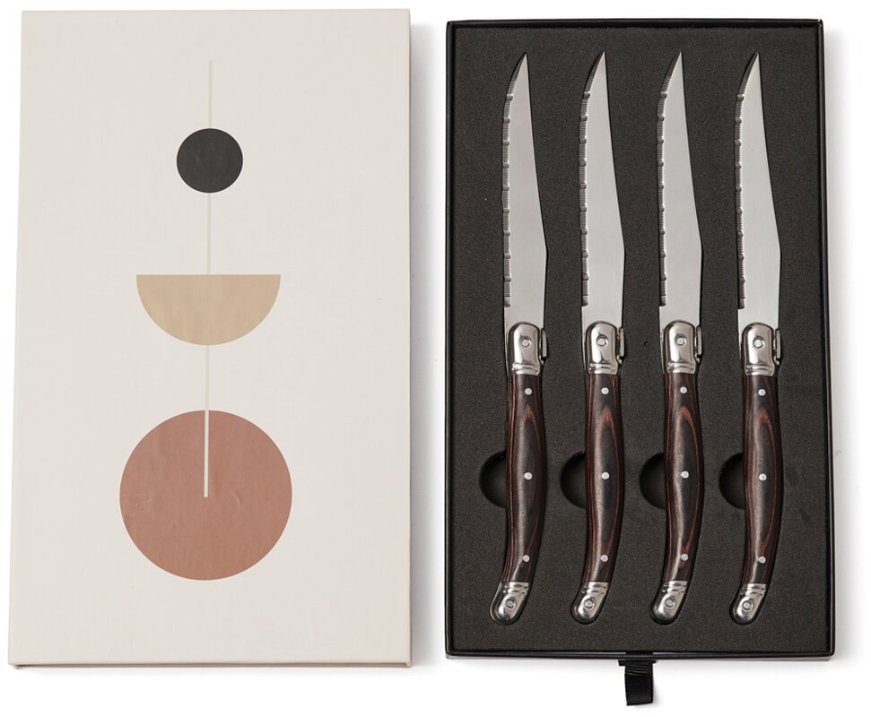 Vysoce kvalitní nože na maso v unikátním bistro stylu inspirovaném Francií. Rukojeť z černého dřeva pakka a čepele z vysoce kvalitní nerezové oceli zajišťují pohodlí a kvalitu řezu. Čepel má jemné zoubky, což vám umožní krájet potraviny s minimálním odporem. Sada čtyř nožů, které můžete snadno sladit s domácími vidličkami. Baleno v exkluzivní dárkové krabičce.