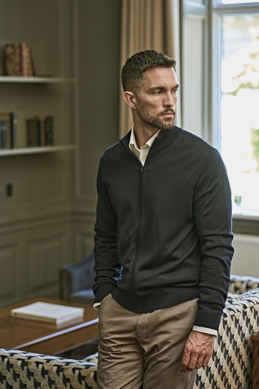 Svetr je vyroben z prémiové italské smíšené příze kombinující 50 % merino vlny a 50 % polyakrylu. Merino svetr s regulací vlhkosti zajišťuje optimální komfort při různých teplotách. Lehce vypasovaný střih s žebrovanými manžety a skrytým SBS zipem dodává svetru elegantní vzhled.
