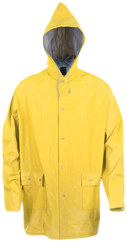 Odolná pláštěnka s kapucí vyrobená z PVC se speciální žáruvzdornou povrchovou úpravou. Praktický střih s pohodlným zapínáním na knoflíky a dvěma prostornými předními kapsami pro uložení drobností.