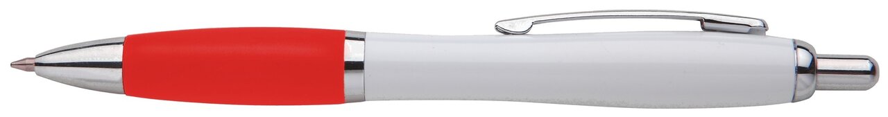 Plastové propisovací pero JESI s bílým tělem. Ostatní doplňky jsou stříbrné. Náplň je velkoobsahová, modře píšící.