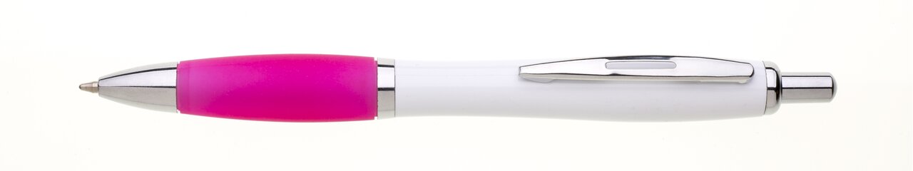 Plastové propisovací pero JESI s bílým tělem. Ostatní doplňky jsou stříbrné. Náplň je velkoobsahová, modře píšící.