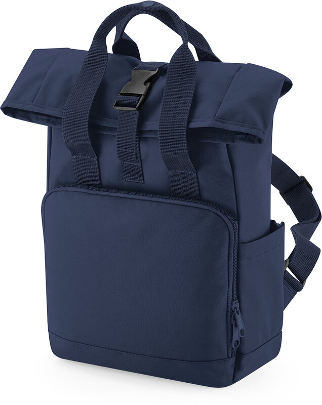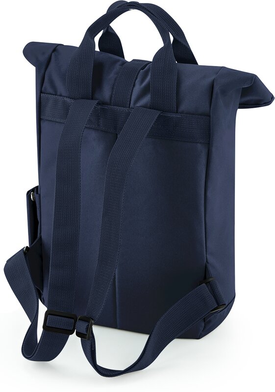 Rolovací batoh s dvojitým držadlem, BG118 velikost S 2 rukojeti, rukojeti z popruhů, nastavitelné ramenní popruhy, přední kapsa na zip, kapsa na láhev, polstrovaná zadní stěna, štítek TearAway, objem 9l, rozměry: 23x32x11cm, pouze čistit houbičkou, nesmí se prát 340g, 100% recycklovaný 600D Polyester, rPET