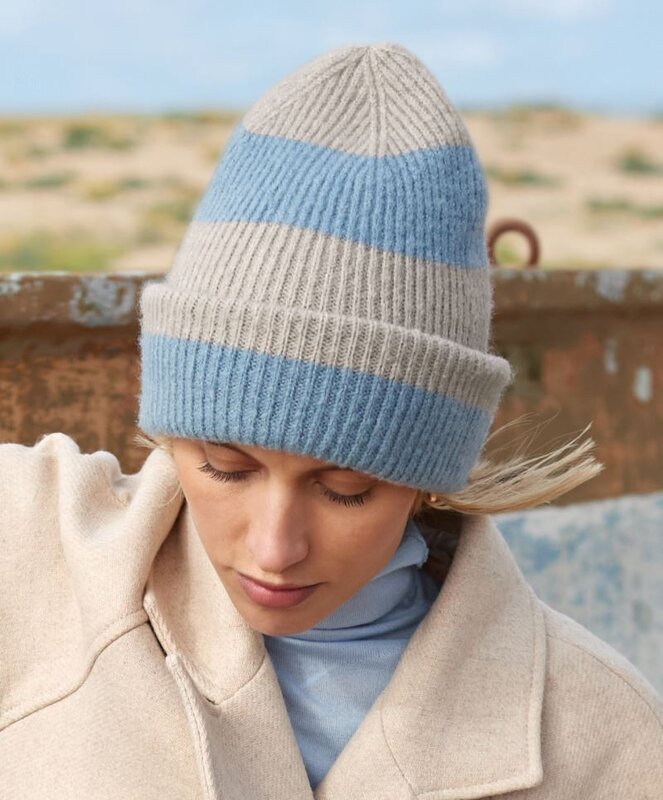 atraktivní zimní čepice se širokým lem, pruhovaný design, měkké na omak, štítek TearAway, ruční praní, nelze sušit v sušičce, nelze chemicky čistit 53% recyklovaný polyester, 33% nylon, 10% polyakryl, 4% elastan