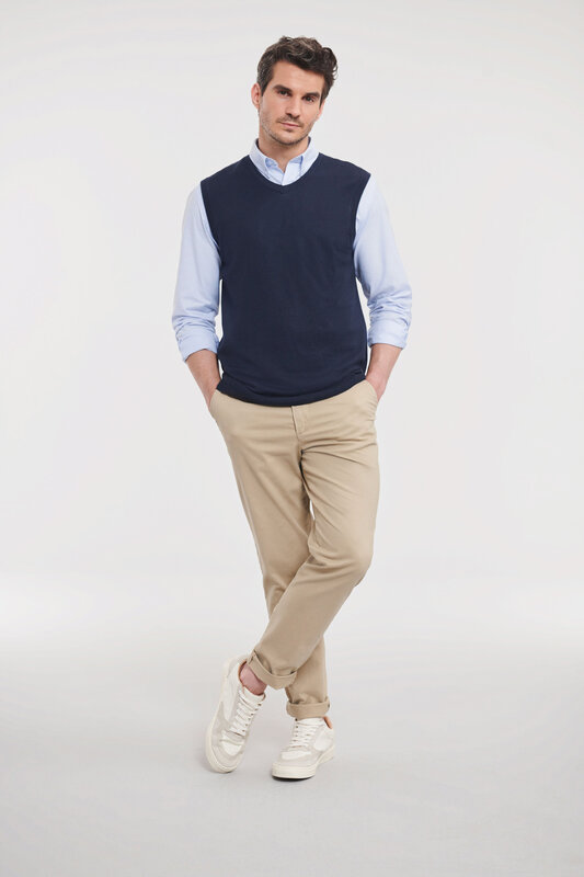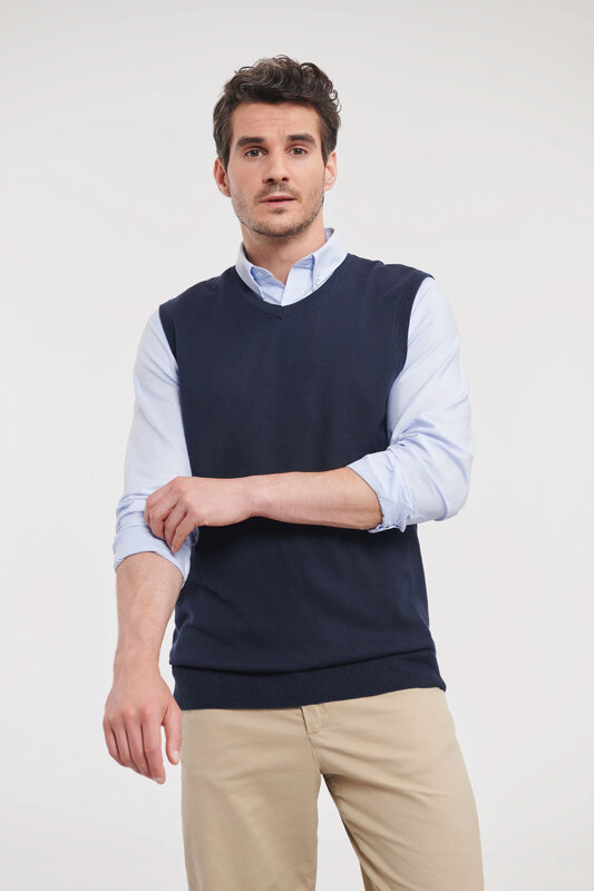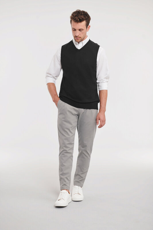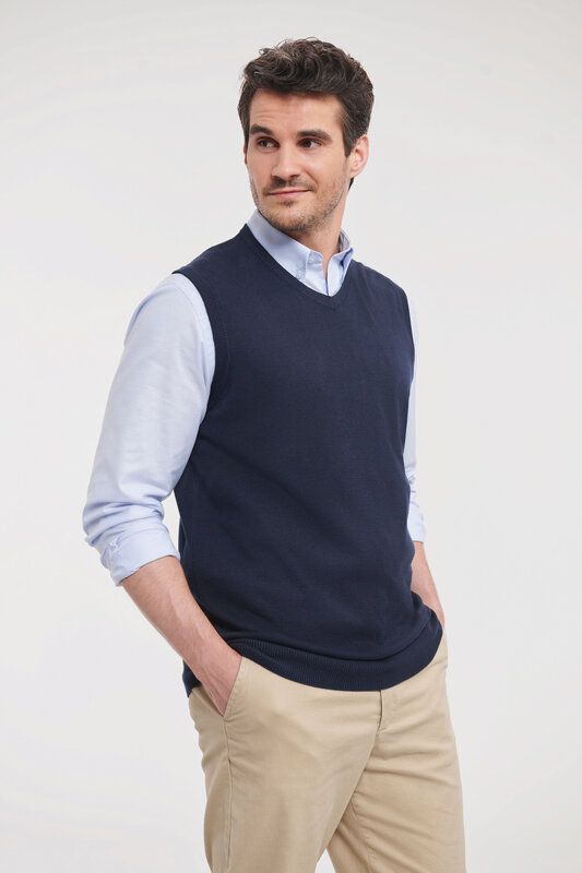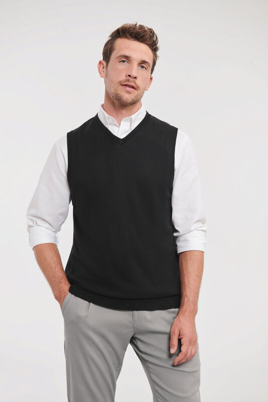 Pletená vesta s výstřihem do V, Pas a manžety s elastanem pro dlouhodobé držení tvaru, snadná péče, rychleschnoucí, pratelné na 40°, lze sušit v sušičce 275g/m², 50% bavlna, 50% polyakryl CottonBlend™