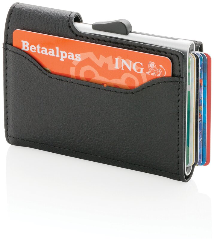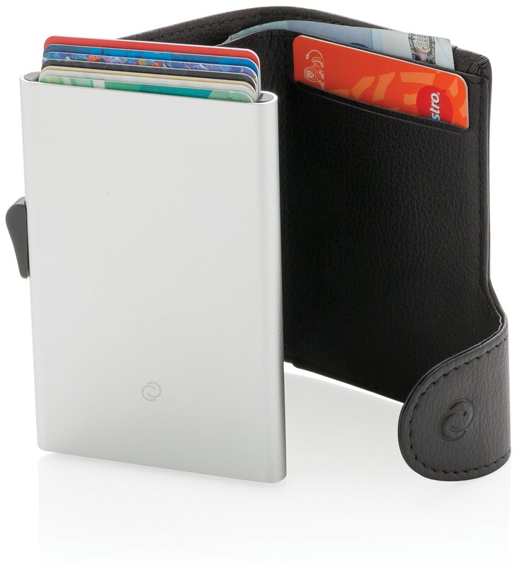Hliníkové pouzdro na karty a bankovky pro ochranu před elektronickými kapesními krádežemi. Pouzdro pojme až 7 karet nebe 5 embosovaných karet. Snadno ovladatelný jezdec karty postupně vytlačí nahoru. Peněženka pojme i hotovost.