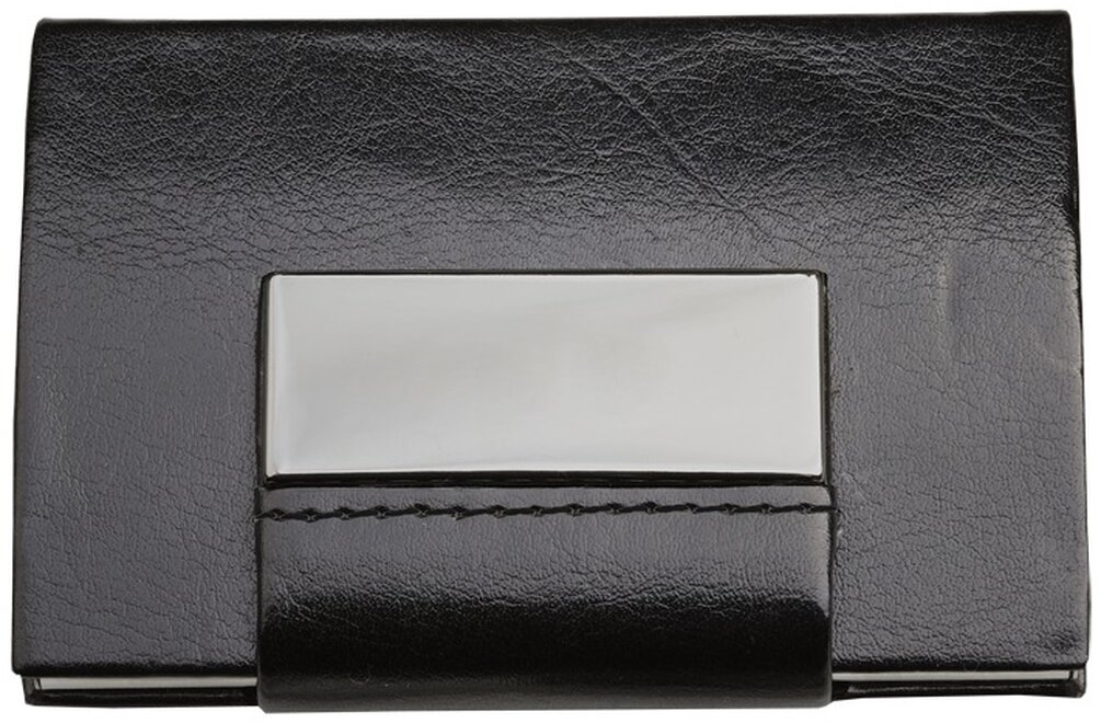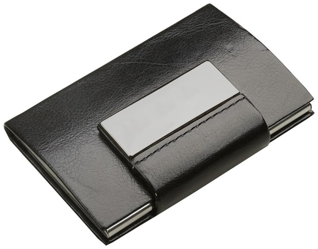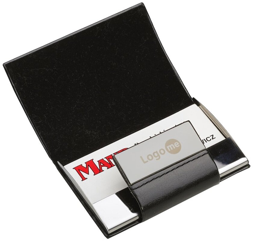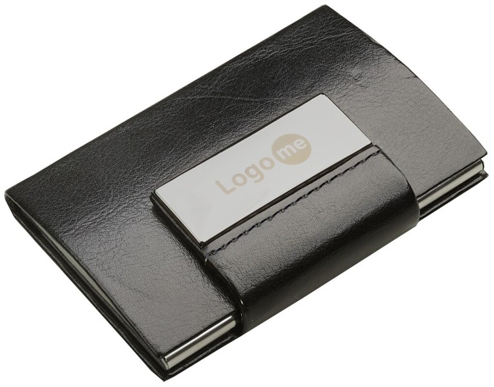 Pouzdro na vizitky z PU kůže s magnetickým zavíráním s vrchní kovovou částí vhodnou pro gravírování laserem. Dodáváno v černé krabičce.