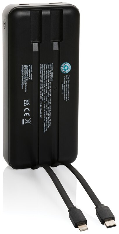 Mimořádně rychlá powerbanka s kapacitou 20 000 mAh a výkonem 65 W pro nabíjení všech vašich zařízení včetně notebooků. Integrované kabely s konektory USB C a iOS. Výstupy: USB C: 65 W, USB A: 22,5 W. Rychlé dobíjení powerbanky skrze USB C (45 W). Led displej. Obal vyrobený z RCS recyklovaného ABS plastu. RCS (Recycled Claim Standard) je globální standard, který umožňuje ověřit použití recyklovaného materiálu v produktu napříč celým dodavatelským řetězcem. Celkový podíl recyklátu dle váhy produktu: 23 %.