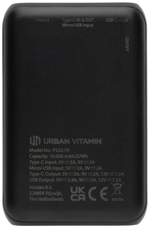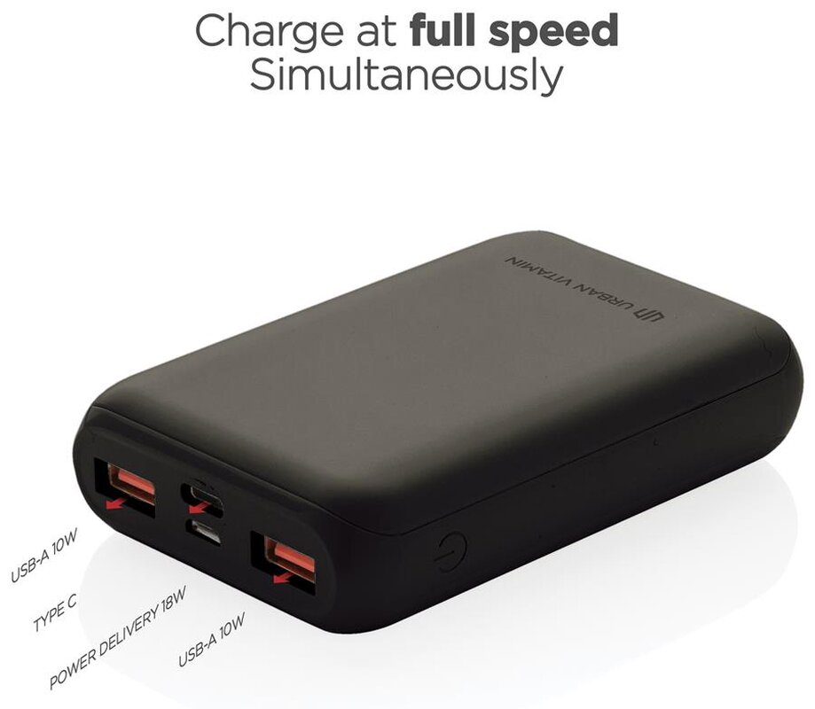 Super rychlá powerbanka značky Urban Vitamin. Díky 18W PD USB C portu nabije telefon za rekordně rychlou dobu. Na 50 % kapacity baterie nabije již za 30min. Obsahuje kvalitní baterii řady A s kapacitou 10 000 mAh. 2 USB A a 1 USB C port umožňují dobíjet až 3 zařízení naráz (včetně notebooků). Produkty značky Urban Vitamin jsou vyrobeny bez PVC a baleny v ekologickém balení. USB C vstup: 5V/3A, 9V/2A; Micro USB vstup: 5V/2A, 9V/2A; USB C výstup: 5V/3A, 9V/2A, 12V/1,5A; USB A výstup: 5V/2,4A, 9V/2A, 12V/1,5A.