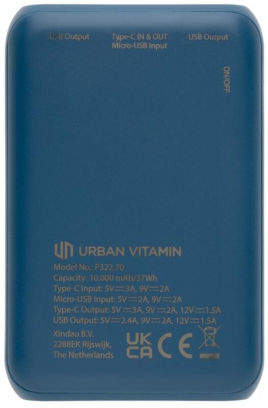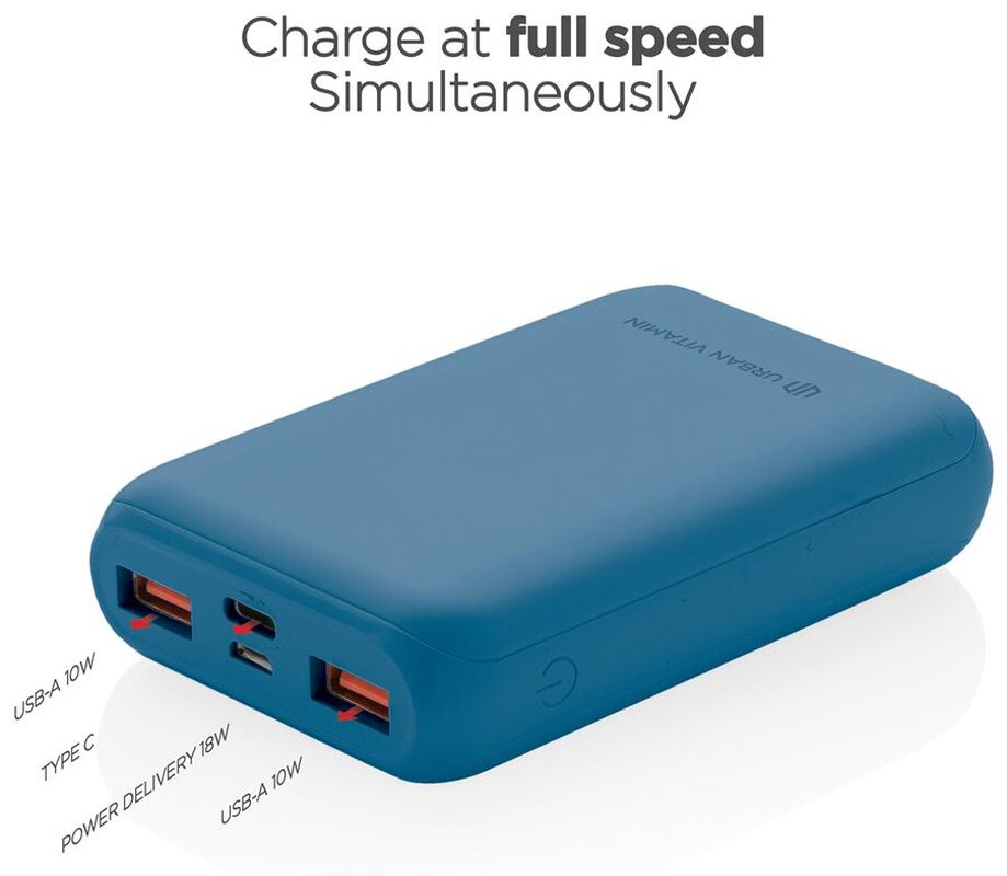 Super rychlá powerbanka značky Urban Vitamin. Díky 18W PD USB C portu nabije telefon za rekordně rychlou dobu. Na 50 % kapacity baterie nabije již za 30min. Obsahuje kvalitní baterii řady A s kapacitou 10 000 mAh. 2 USB A a 1 USB C port umožňují dobíjet až 3 zařízení naráz (včetně notebooků). Produkty značky Urban Vitamin jsou vyrobeny bez PVC a baleny v ekologickém balení. USB C vstup: 5V/3A, 9V/2A; Micro USB vstup: 5V/2A, 9V/2A; USB C výstup: 5V/3A, 9V/2A, 12V/1,5A; USB A výstup: 5V/2,4A, 9V/2A, 12V/1,5A.
