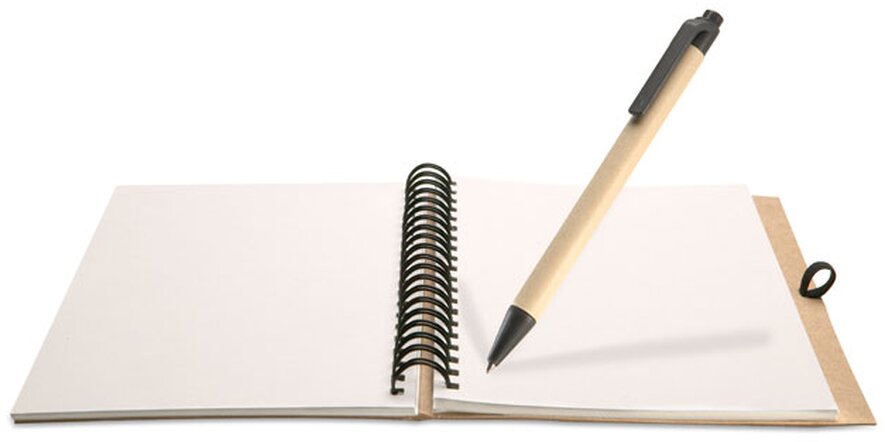 Recyklovaný zápisník s biologicky odbouratelným perem, které má modrou náplň je ideálním dárkem pro vaše zaměstnace do kanceláře nebo obchodní partnery. Vnitřek bloku má 70 čistých recyklovaných stránek pro vaše poznámky.