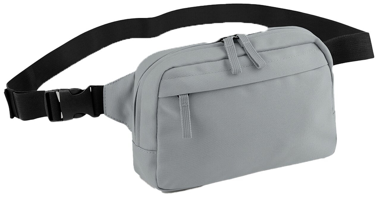 Recyklovaný polyester 600D Plně podšitý recyklovaným polyesterem 210D Bez PVC Otvírání na dvoucestný zip pro snadný přístup Přední kapsa na zip Plně nastavitelný bederní pás Štítek TearAway Objem: 2 l 100% polyester Nelze prát Polyester (100%) Ledvinky