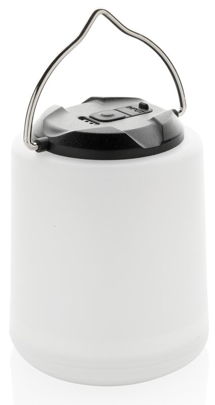 Přenosná dobíjecí LED lampa Limio z recyklovaného ABS plastu s RCS certifikací, ideální pro firemní potisk. Vhodná pro vnitřní i venkovní použití, lze postavit na stůl nebo zavěsit. LED světlo nabízí svítivost až 300 lumenů a tři režimy (silné, tlumené, blikající). Dobíjecí baterie přes USB-C poskytuje až 4 hodiny svícení, plné nabití za 2 hodiny. Krytí IPX4 umožňuje použití ve vlhkém prostředí.