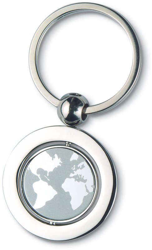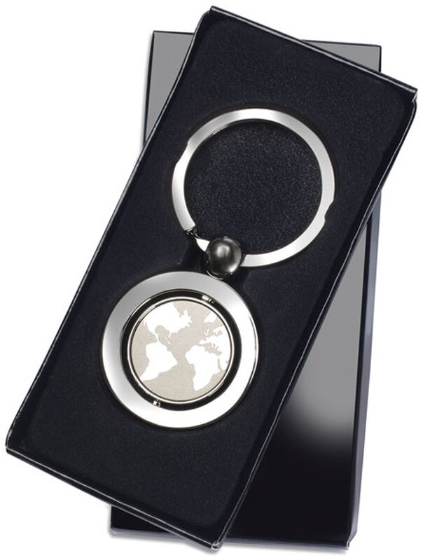 Kovový přívěsek na klíče se vzorem zeměkoule. Dodáváme v černé dárkové krabičce.